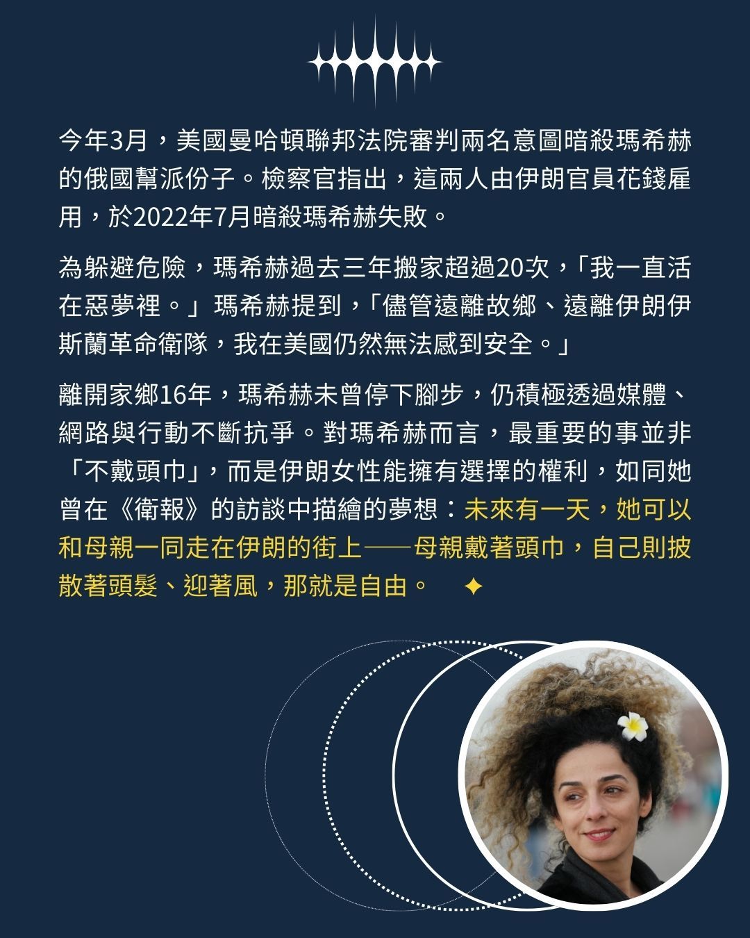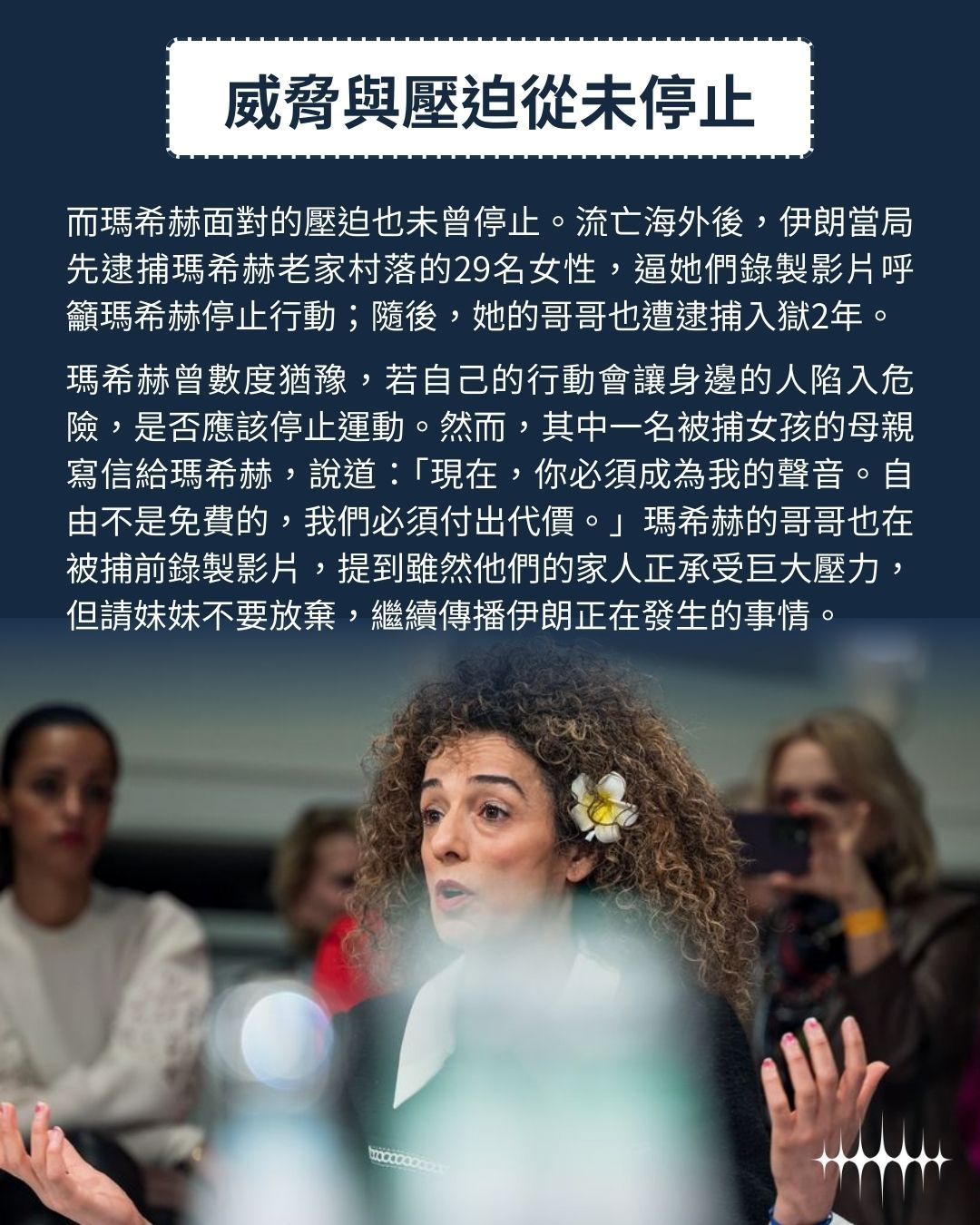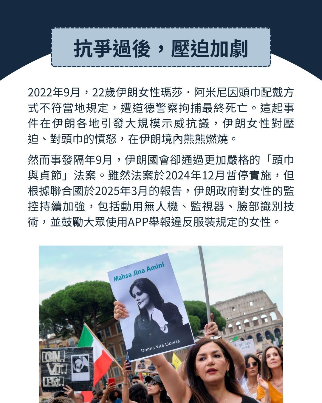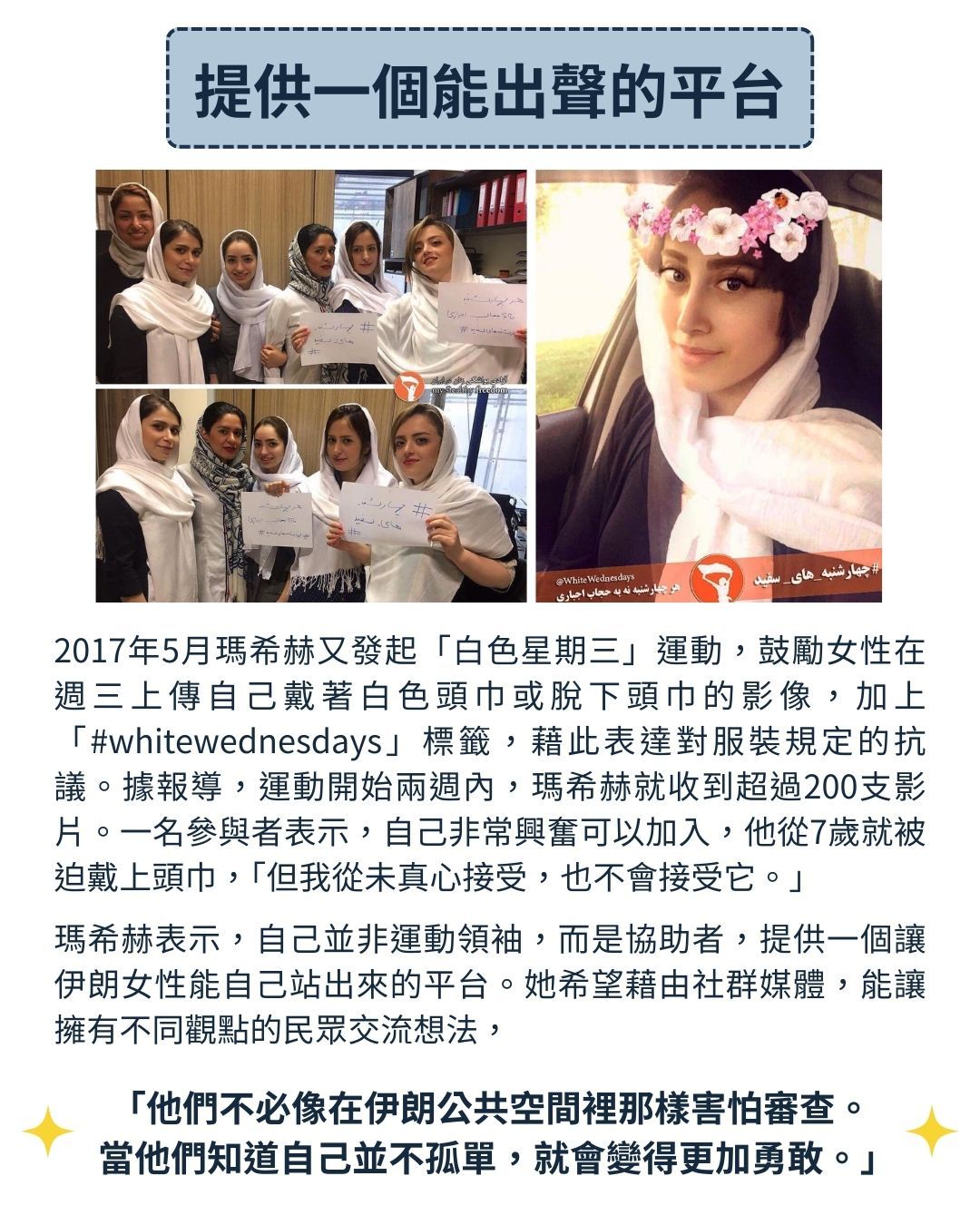 在2022年廣受全球關注的「阿米尼之死」,以及後續席捲伊朗各地的「頭巾革命」之前,許多伊朗女性長期與規定抗爭,希望能揭開頭巾、找回自己的衣著自由。例如〈在伊朗,她被道德警察逮捕〉中,提到的網路運動「我的秘密自由」,在現實中也真有其事。