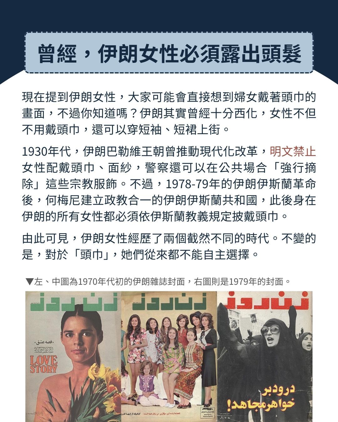提到伊朗女性,大家可能會直接想到婦女戴著頭巾、身穿黑袍的畫面,不過你知道嗎?伊朗曾經十分西化,女性不但不用戴頭巾,還可以穿無袖、迷你裙上街。
