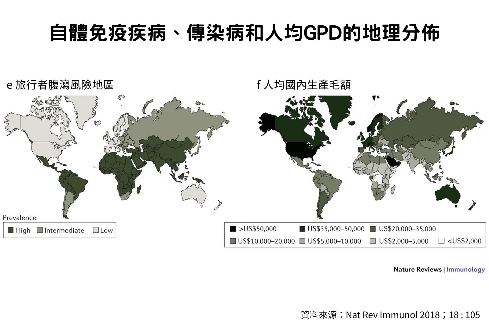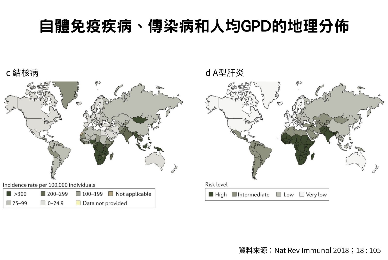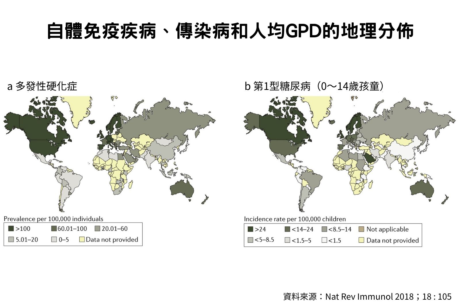 從地圖來看,傳染病肆虐地區與自體免疫疾病好發地區也具有互補關係。非洲、南美、南亞等地,是結核病、A型肝炎、由沙門氏桿菌(Salmonella)以及大腸桿菌等細菌引起的傳染性腸胃炎的肆虐地區;另一方面,西歐、北歐、美國和加拿大等地幾乎不見這些傳染病的蹤跡,但是罹患多發性硬化症與第一型糖尿病等疾病的機率非常高。