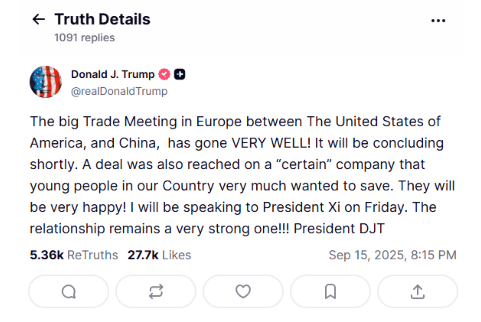 根據CNN報導,美國財政部長貝森特(Scott Bessent)週一表示,美中雙方已在西班牙馬德里達成一份「框架協議」(Framework Agreement),允許TikTok繼續在美國運營,並將由美資主導的財團接手其美國資產。美國總統川普將在週五與中國國家主席習近平(Xi Jinping)通話,為後續高峰會鋪路。這份協議被視為川普第二任期內,美中關係的重要突破口之一。