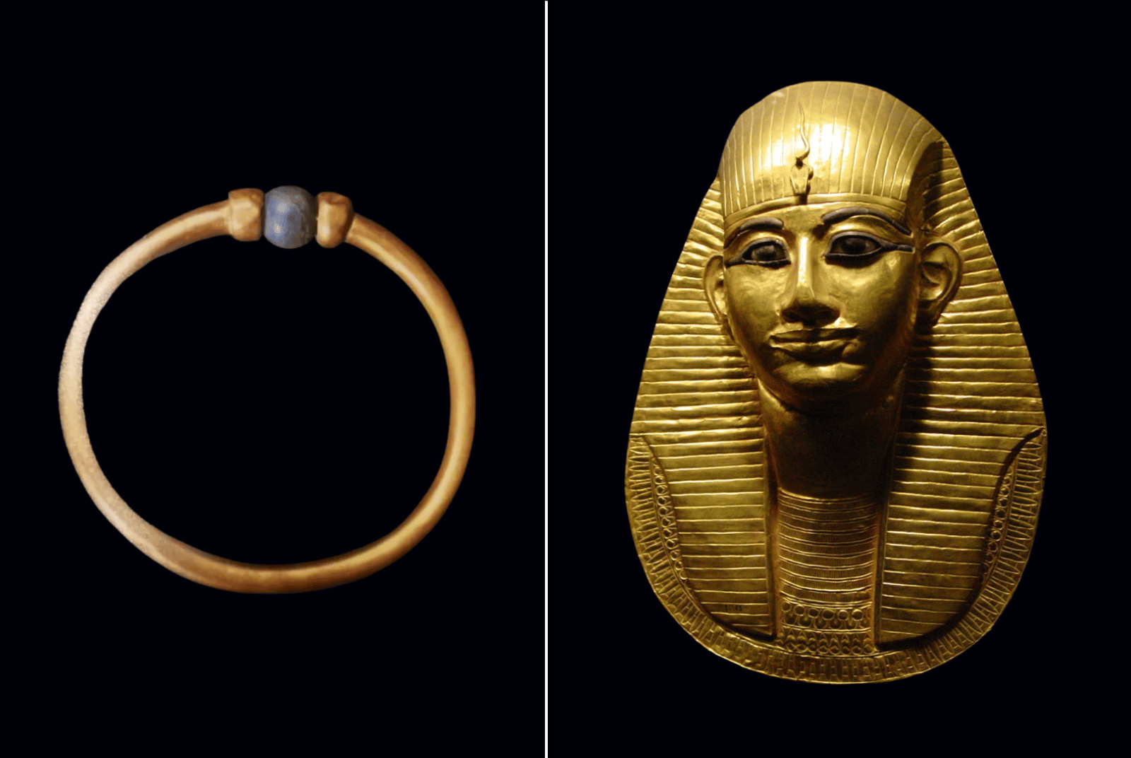 鑲嵌青金石珠的黃金手鐲(圖左),相傳出自法老阿蒙尼莫佩時期(圖右)。