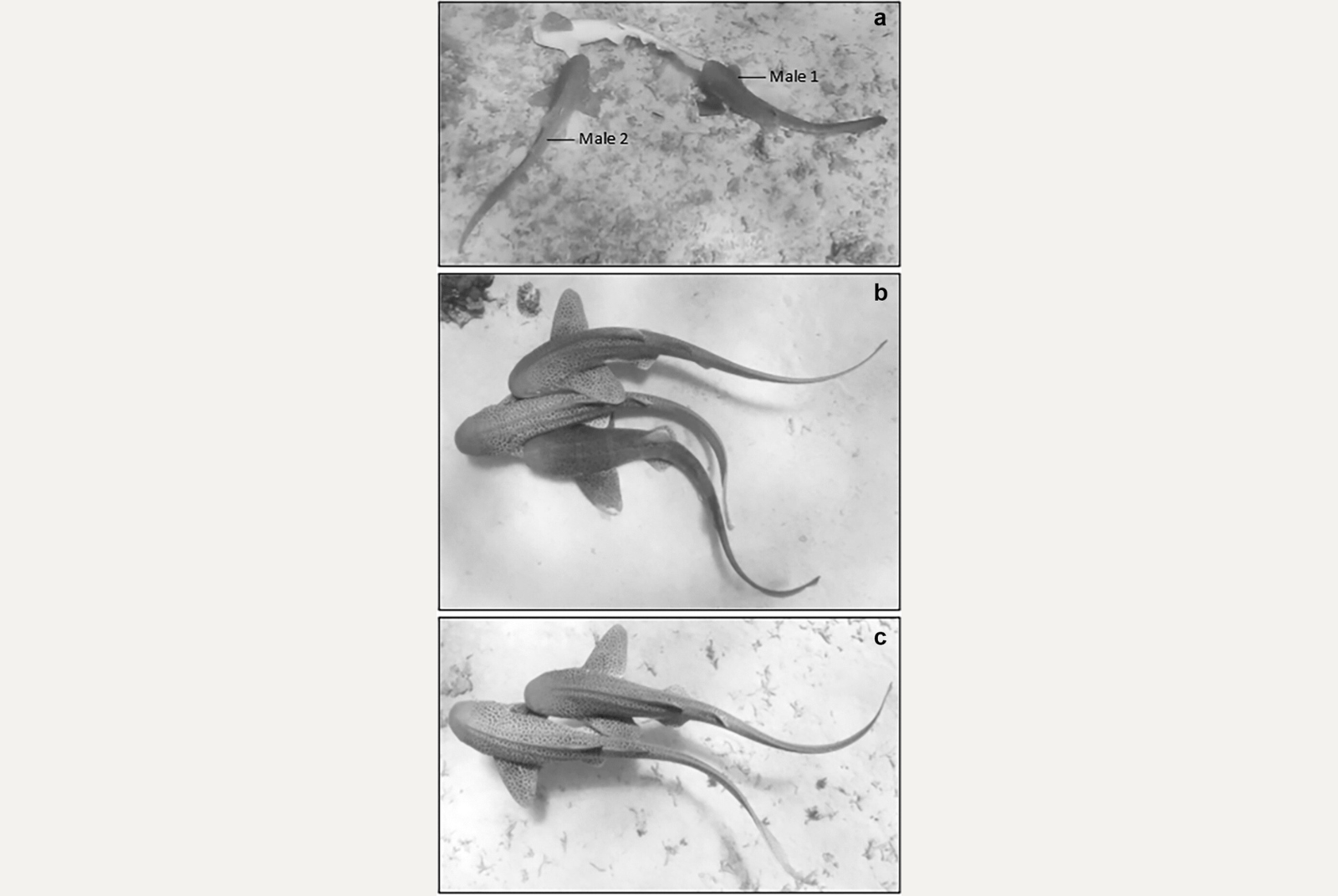 兩隻雄鯊魚先後與雌鯊交配。