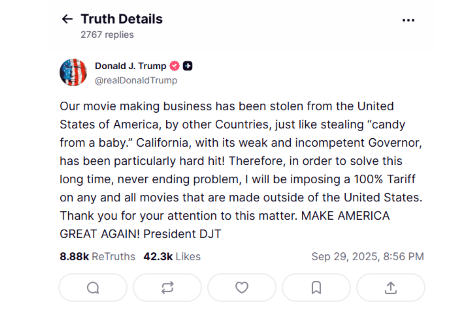 9月30日,川普再次Truth Social上發文,重申他在5月曾提出要對所有在美國境外製作的電影課徵100%關稅的主張。這次,川普的語氣更為激烈,不僅形容這些外國製作「就像『從嬰兒手裡搶糖果』一樣,」更將矛頭指向加州州長葛文紐森,批評「紐森的軟弱無能,才會導致加州電影業受到特別嚴重的打擊。」
