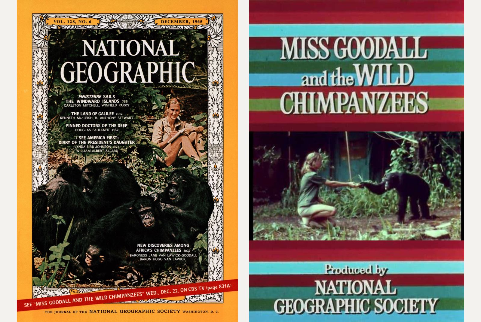 左圖:1965年《國家地理》以珍古德為封面,詳細介紹他對於黑猩猩的突破性發現;右圖:同年《國家地理》也推出首部珍古德的紀錄片。