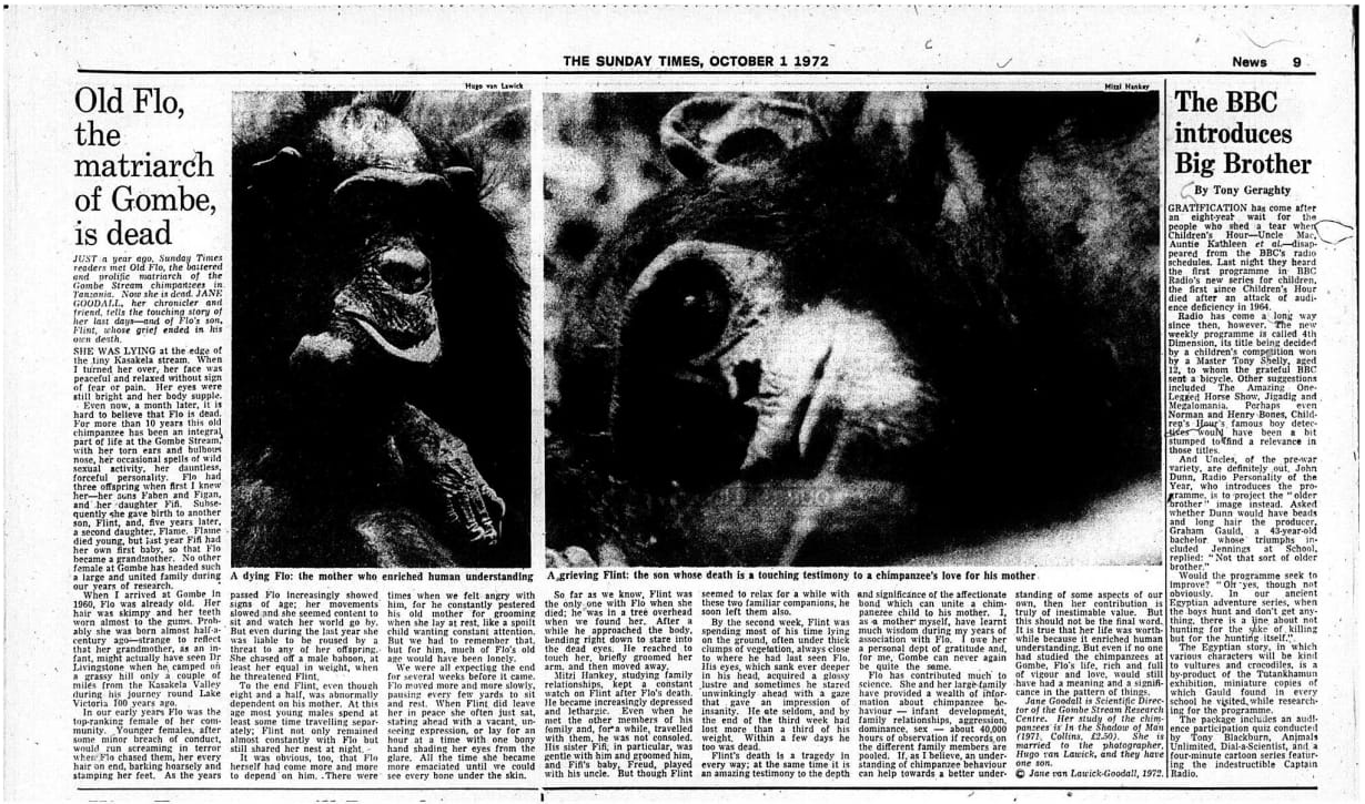 網友the Jane Goodall Institute1972年,一隻於岡貝生活、與珍古德感情緊密的母黑猩猩「Flo」過世,《倫敦星期日泰晤士報》(The Sunday Times)為此Flo刊登了一篇訃聞,這也是該報第一次刊登非人類的訃聞。