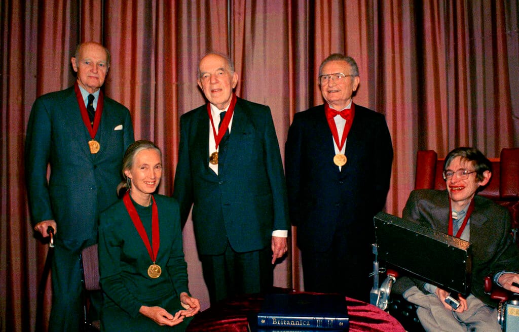 網友the Jane Goodall Institute1989 年,珍古德出席在紐約舉行的大英百科全書獎頒獎典禮。與他一起出席的人員還包括英國理論物理學家史蒂芬.霍金(Stephen Hawking)。