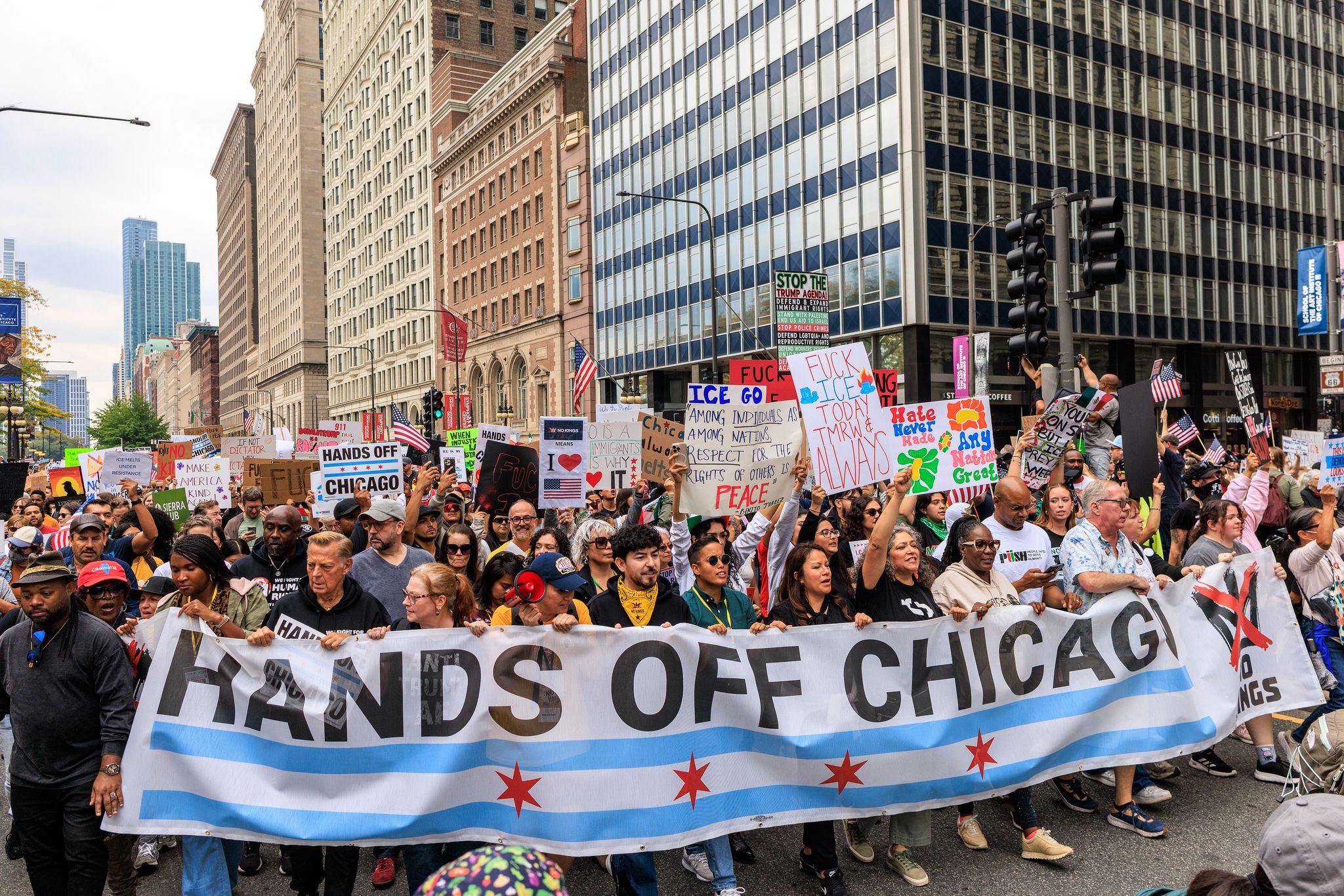 圖為美國芝加哥市中心,抗議者舉起寫有「別碰芝加哥」(Hands off Chicago)的橫幅。