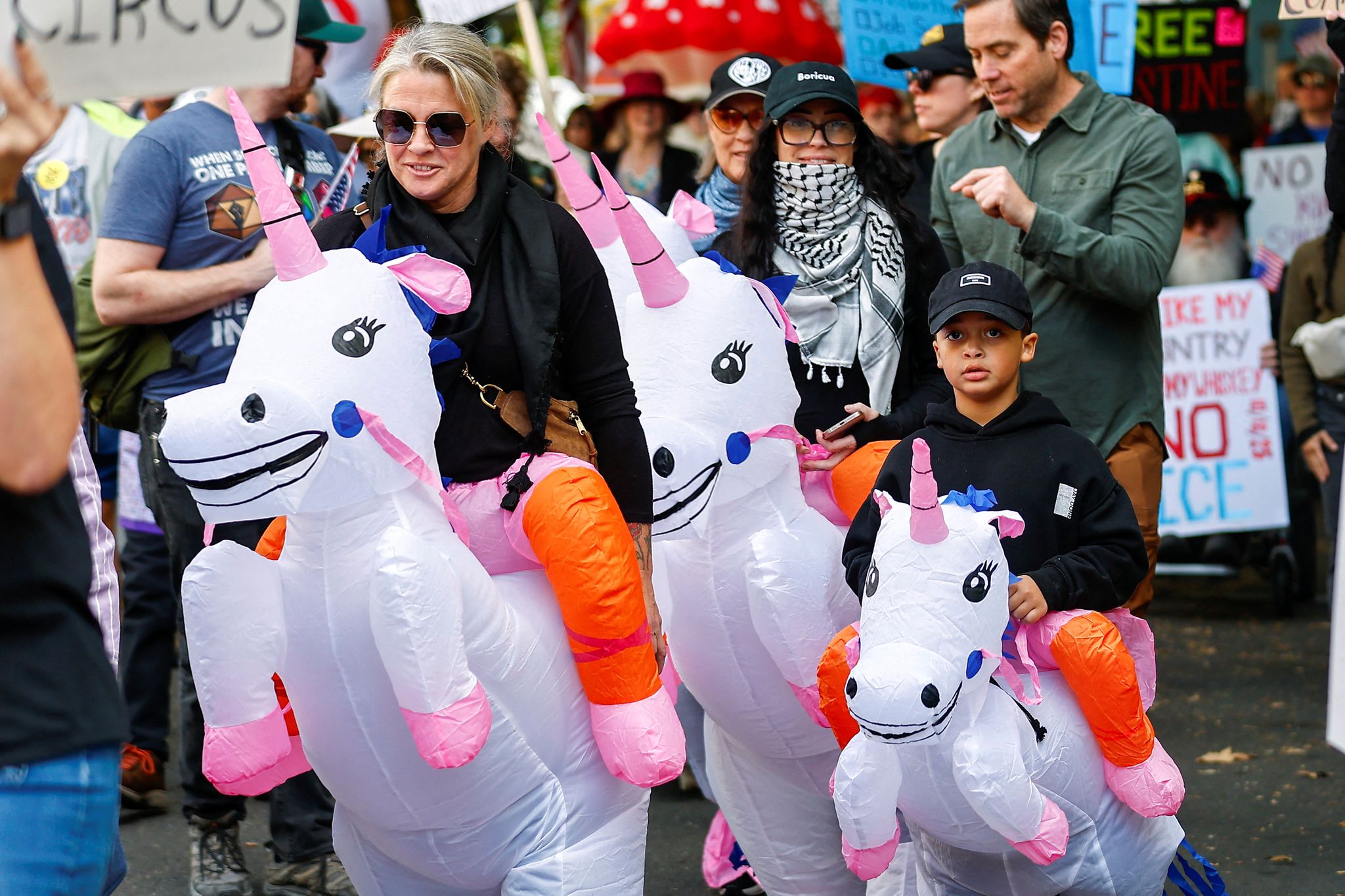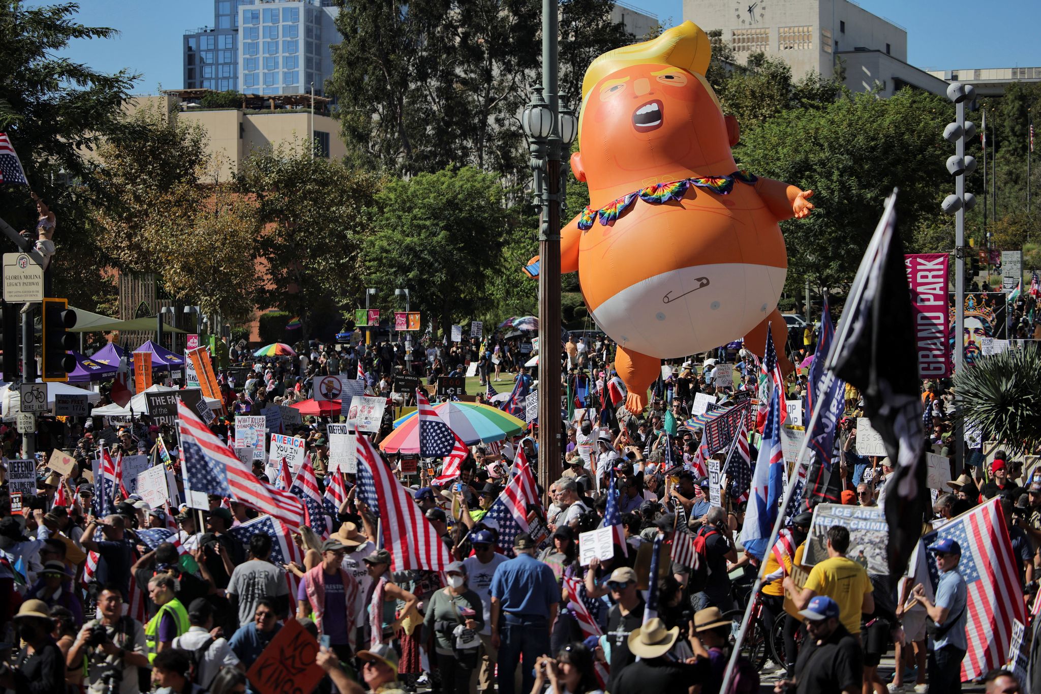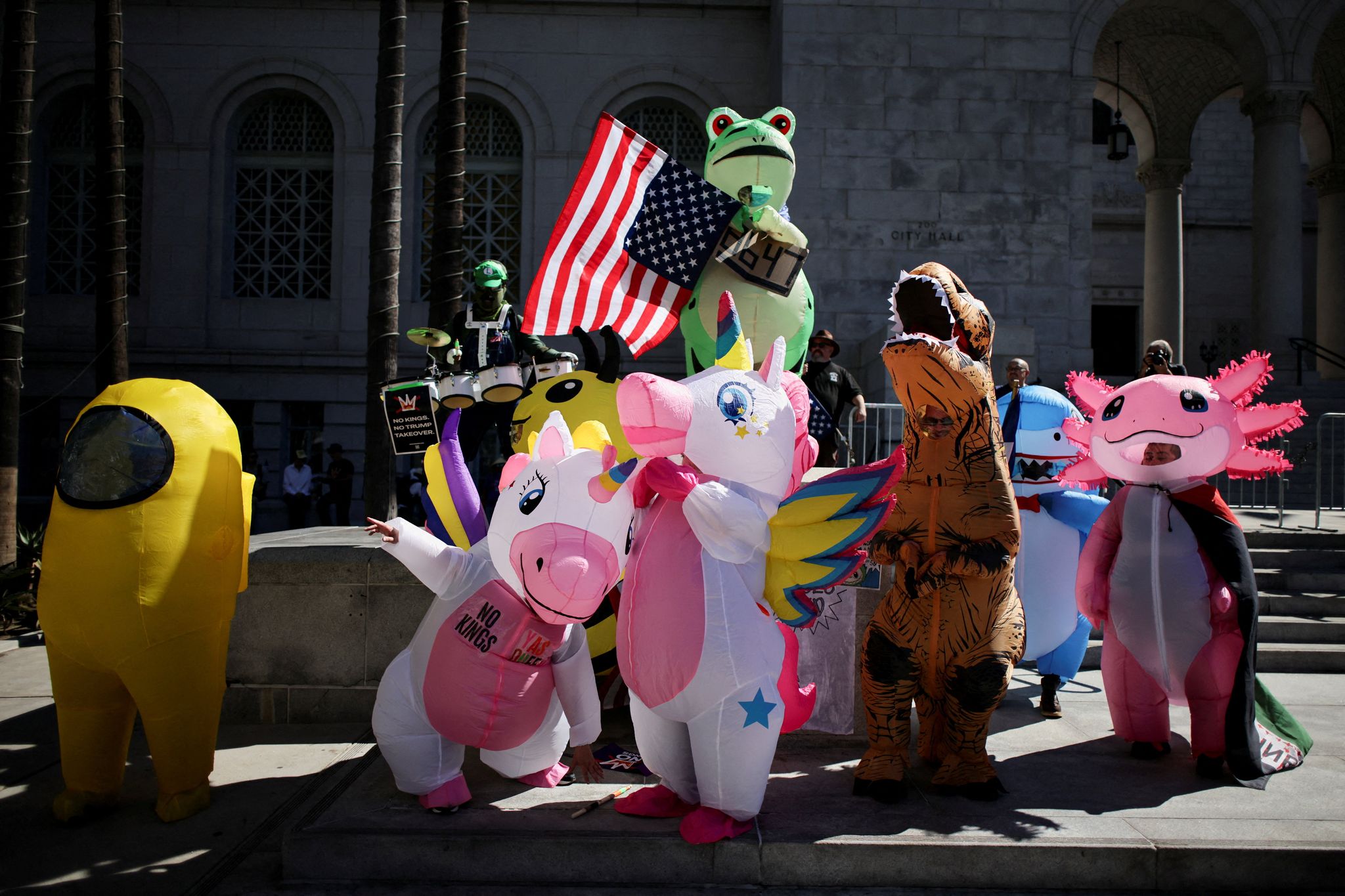 在洛杉磯街頭,到處可見身穿充氣服、揮舞美國國旗的示威者。一名身著獨角獸裝的男子表示,他選擇這套服裝是因為「獨角獸象徵洛杉磯的多樣性與文化」。他補充說,這些服裝也有助於緩和與執法部門的互動,並反駁總統對抗議活動的負面描述:「當你看到街上滿是穿著萬聖節服裝、洋溢著派對氣氛的人群時,很難想像這裡其實是個戰場。」