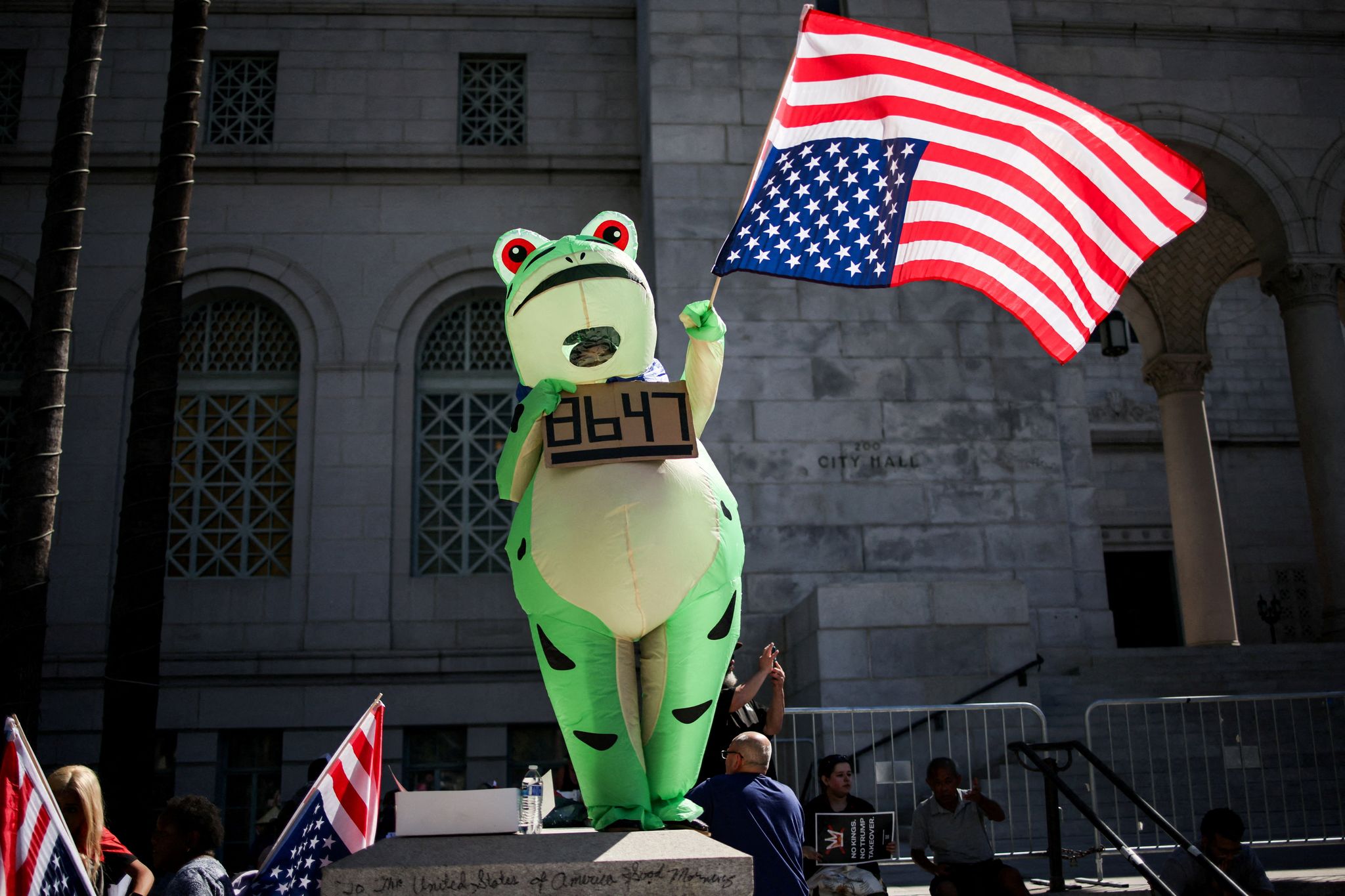 圖為美國洛杉磯,一名身穿充氣青蛙服裝的抗議者手舉「8647」的牌子並揮舞著倒置的美國國旗。其中,「86」在美國俚語代表移除或拒絕,「47」則代表美國第47任總統川普。