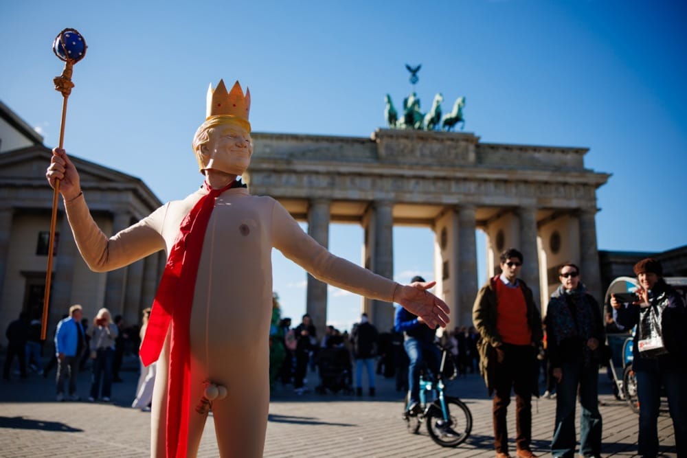 美聯社 / 達志影像null圖為德國柏林布蘭登堡(Brandenburg Gate)門前,一名示威人士帶著川普頭套、頭頂王冠,扮裝成童話故事《國王的新衣》。