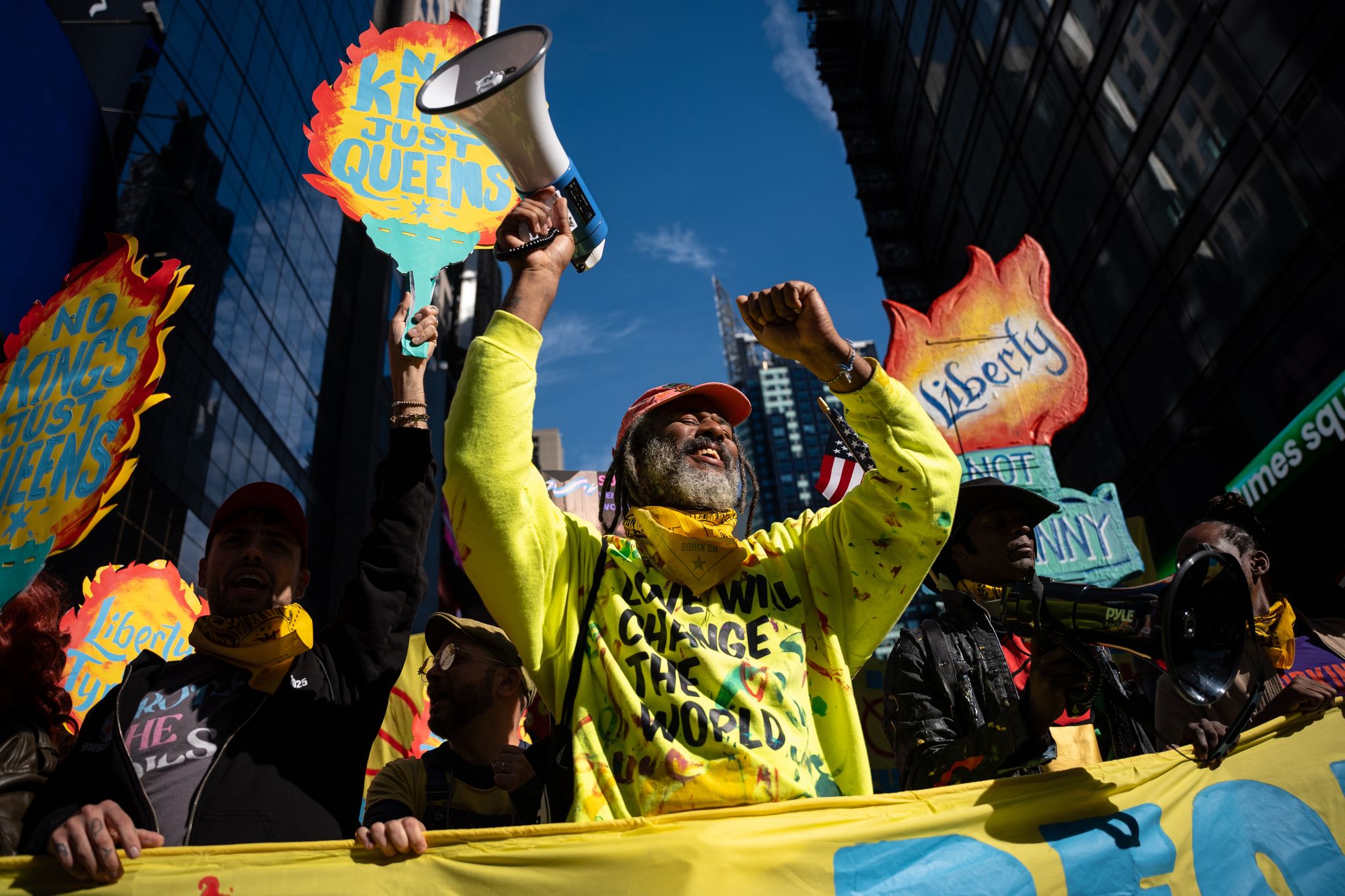 80歲的瑪麗蓮里肯(Marilyn Ricken)曾參加六月的「不要國王」的集會遊行,但她說10月18日的活動帶著更強烈的急迫感。她指著身旁抗議者正在一張巨大的美國憲法複製品底部簽名的畫面,表示:「改變就是這樣發生的。」