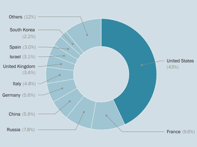 圖為斯德哥爾摩國際和平研究所(SIPRI)2025年3月報告,2020至2024年期間,全球主要武器出口國的市場佔比。