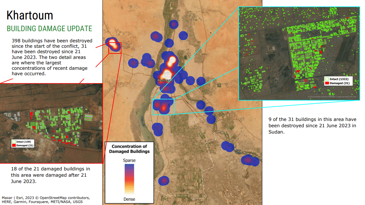 耶魯人道研究實驗室(Yale Humanitarian Research Lab)進一步透過衛星影像觀察,發現埃爾法舍爾街道上出現「與成人屍體大小相符的聚集物」,且有「顏色變化,可能為血跡」,與近期報告的屠殺事件「高度一致」。分析指出,R.S.F.似乎封鎖街區、進行「逐屋清查」。