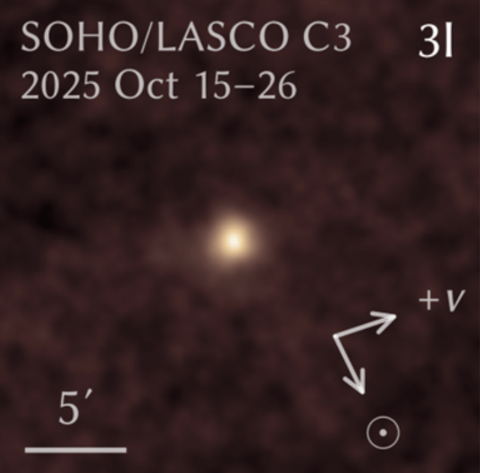 ESA/NASA的SOHO在2025年10月15日至26日期間所捕捉到的3I/ATLAS。彗星在影像中央僅呈現為一個微弱的亮斑。