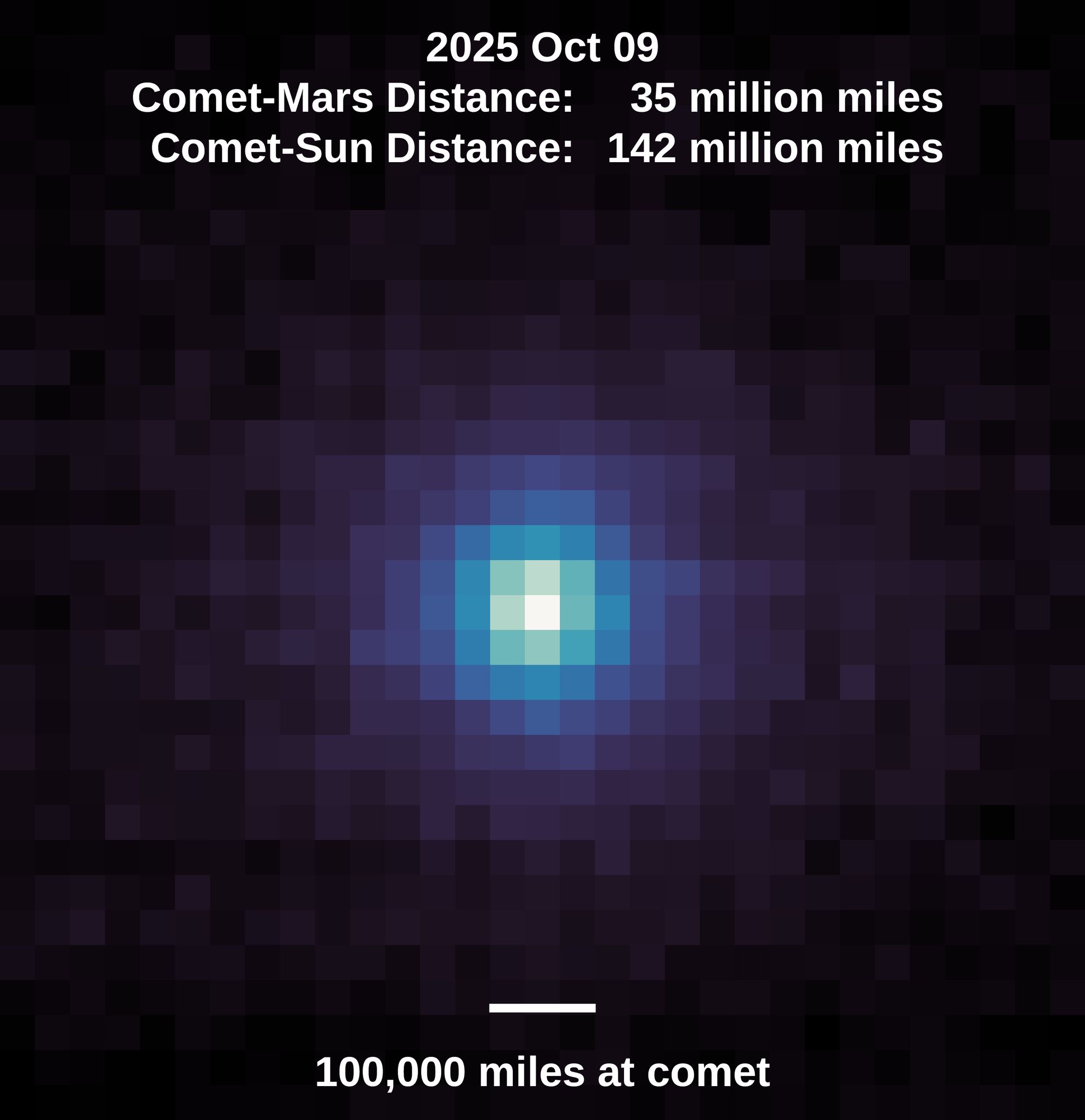 2025年10月2日由MRO上的高解析度成像科學實驗(HiRISE)相機拍攝的彗星影像。拍攝時彗星距離衛星約0.2天文單位。