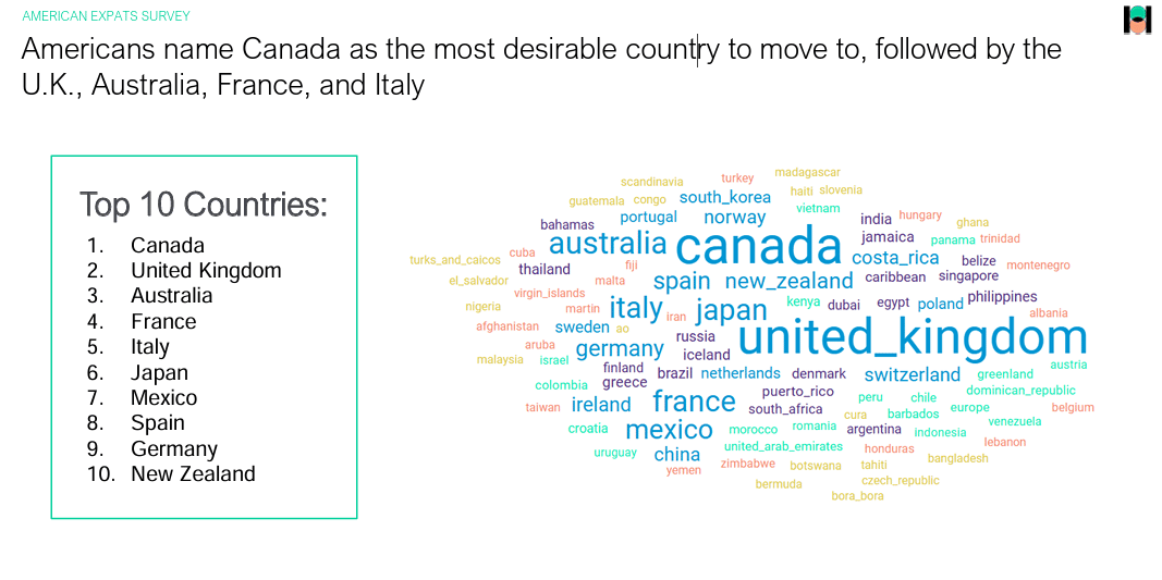 哈瑞斯民調調查顯示,美國人考慮離開美國赴海外的主因包括:生活費用較低(49%)、對當前政治不滿(48%)及對更高生活品質的追求(43%)。Expatsi國際搬遷與旅外資訊公司今年中一份類似調查發現,美國人最有興趣前往定居的前五名國家,分別是葡萄牙、西班牙、英國、加拿大與義大利。