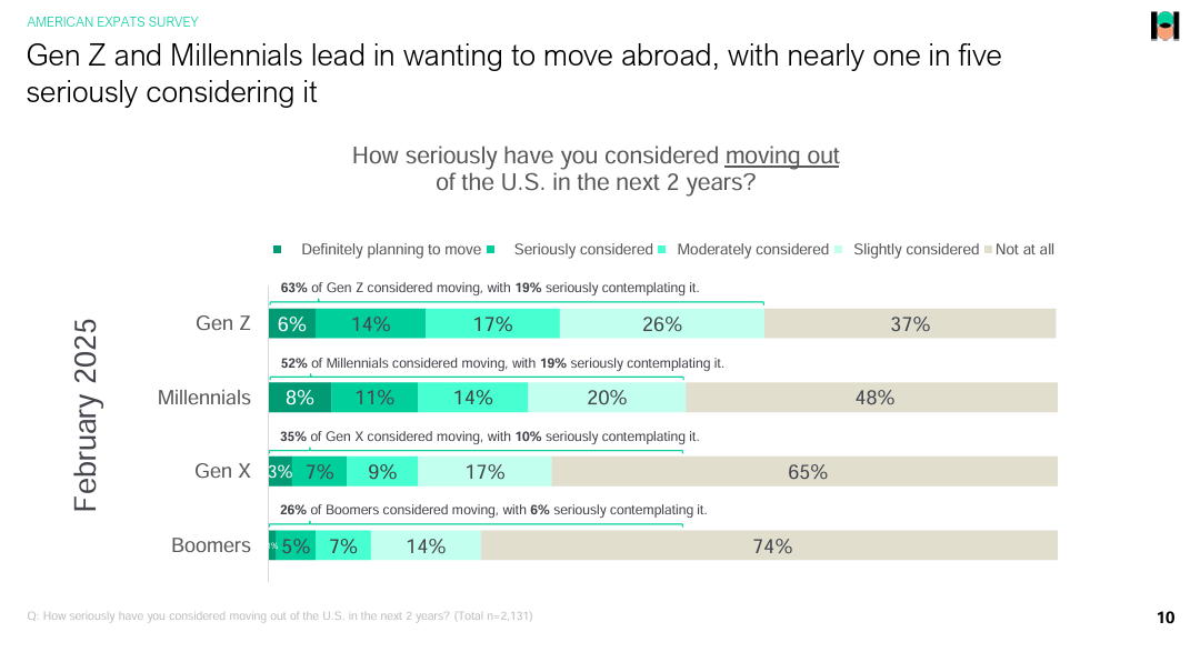 《新聞週刊》(Newsweek)引用美國市調權威「哈瑞斯民意調查」(Harris Poll)2025年初一份調查發現,10名美國成人中就有四名(42%)曾考慮或計劃移居海外,以改善生活品質或財務狀況;在Z世代(1990年代中期至2010年代初期)中,這個比例上升至63%;千禧世代(約1980年代初期至1990年代中期)也有高達52%考慮移居海外。