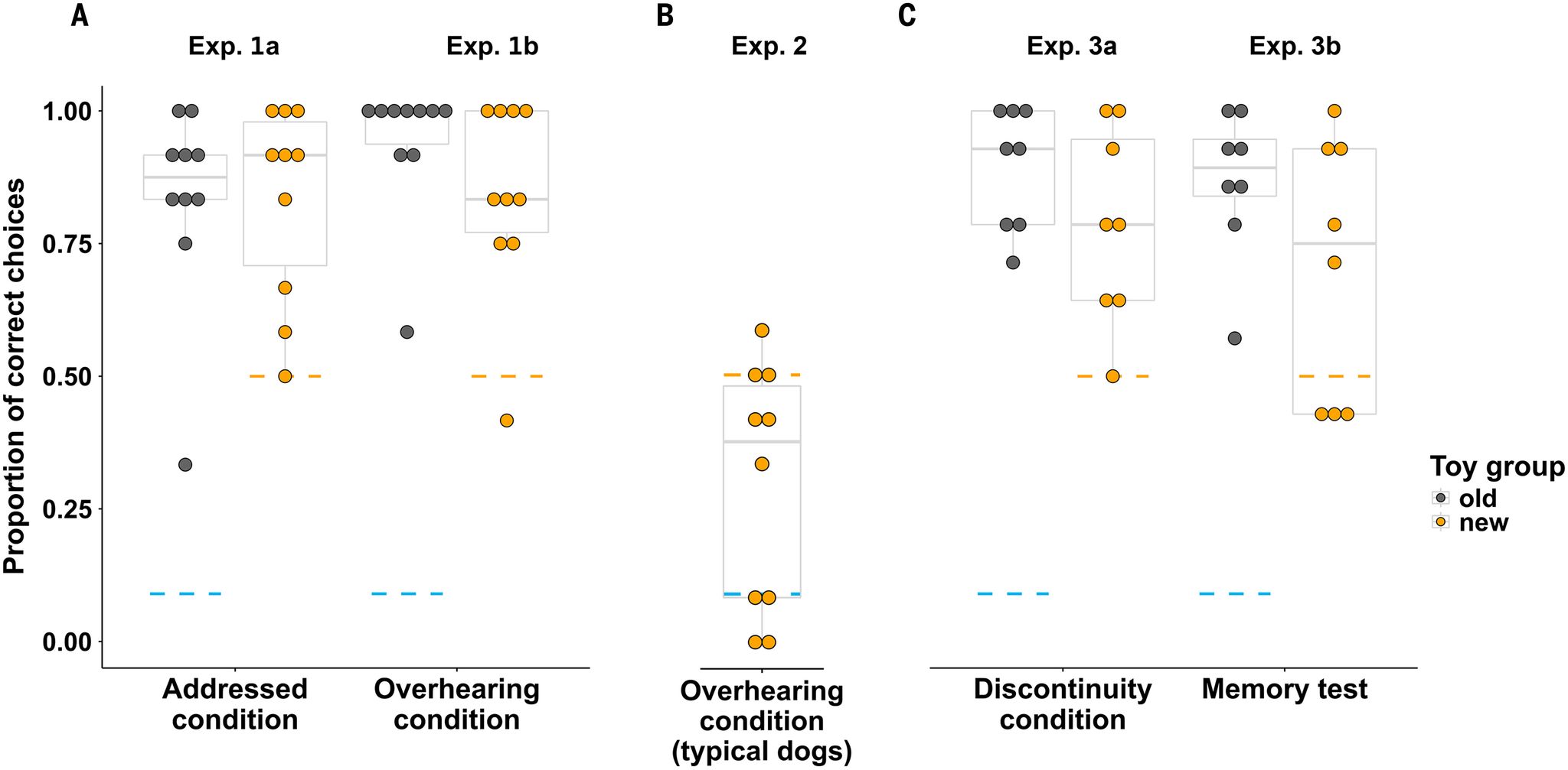 為了檢驗這些狗狗是否和孩童一樣,能夠透過視線、觀察他人行動等方式來學習新的物體名稱,研究團隊進行了第三項實驗。在這階段的實驗,主人將玩具放進桶子裡,狗狗沒辦法直接看到內容物,飼主會看著桶子說出了玩具的名字,結果顯示多數狗狗都能成功叼回玩具。