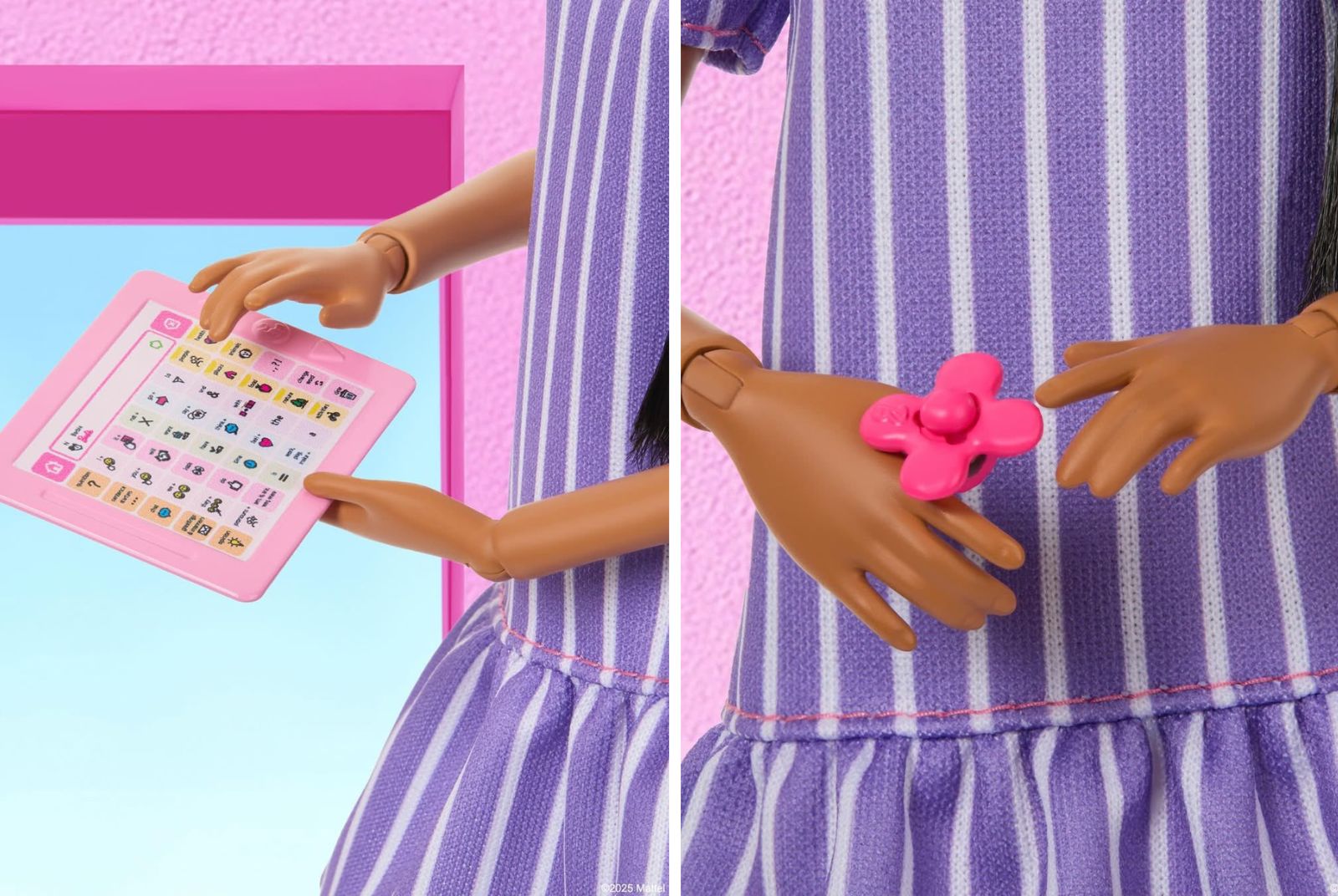 首先,這款芭比強化了手部關節的活動性。因自閉症者會透過拍手、擺動手部等重複性動作,達到「自我刺激」(Stimming),藉此調節情緒,並抵銷因環境感官壓力所帶來的疼痛與不適。因此在遊戲過程中這些高度可動的關節讓芭比能真實演繹這些自我調節的瞬間。