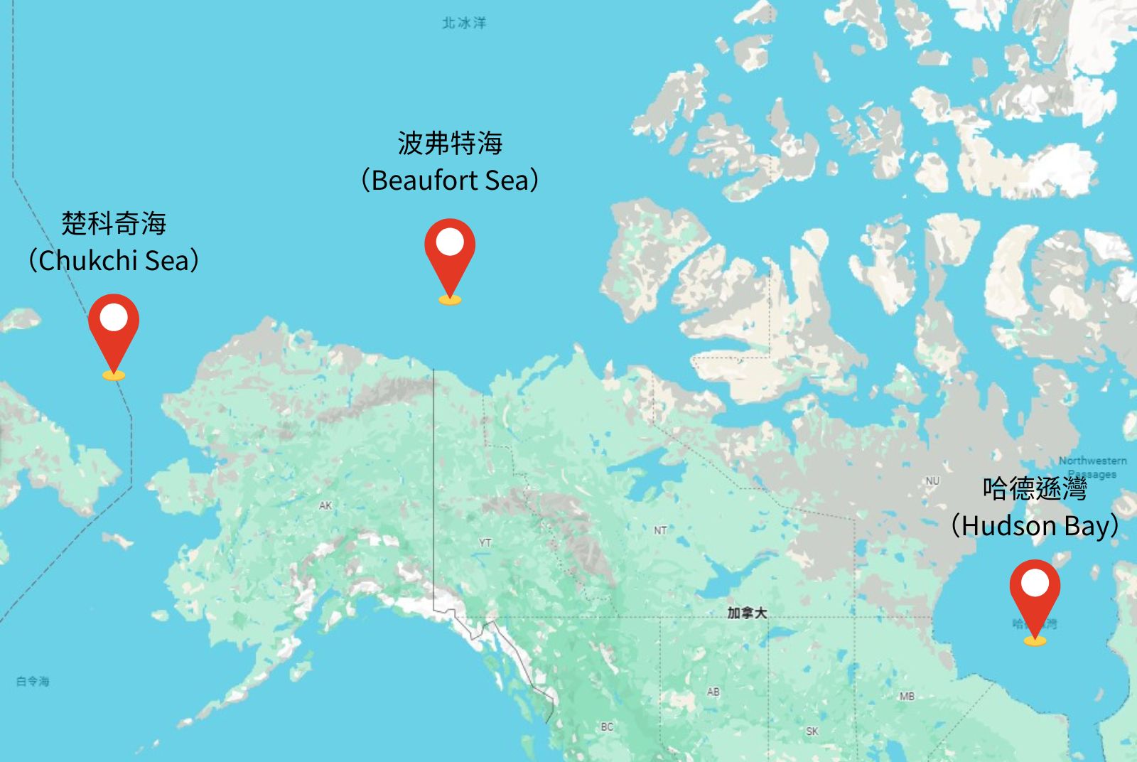 跨越海峽,在北極圈的另一側的加拿大也觀察到了不同的適應情況:在加拿大西邊的哈德遜灣(Hudson Bay)與美國阿拉斯加附近的波弗特海(Beaufort Sea),研究人員注意到因為海冰減少而引起的北極熊健康衰退情形,但在阿拉斯加另一側的楚科奇海(Chukchi Sea),生活在此的3000隻北極熊卻未出現類似的情況,研究團隊認為可能是因為這裡的廣大淺水區蘊藏著足以支撐牠們生活的豐富生態。
