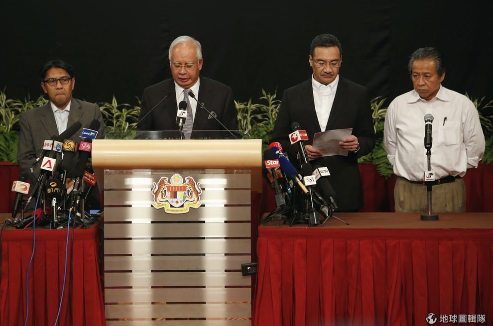 馬來西亞首相納吉沉痛宣布馬來西亞航空MH370班機已經在南印度洋墜海的消息。