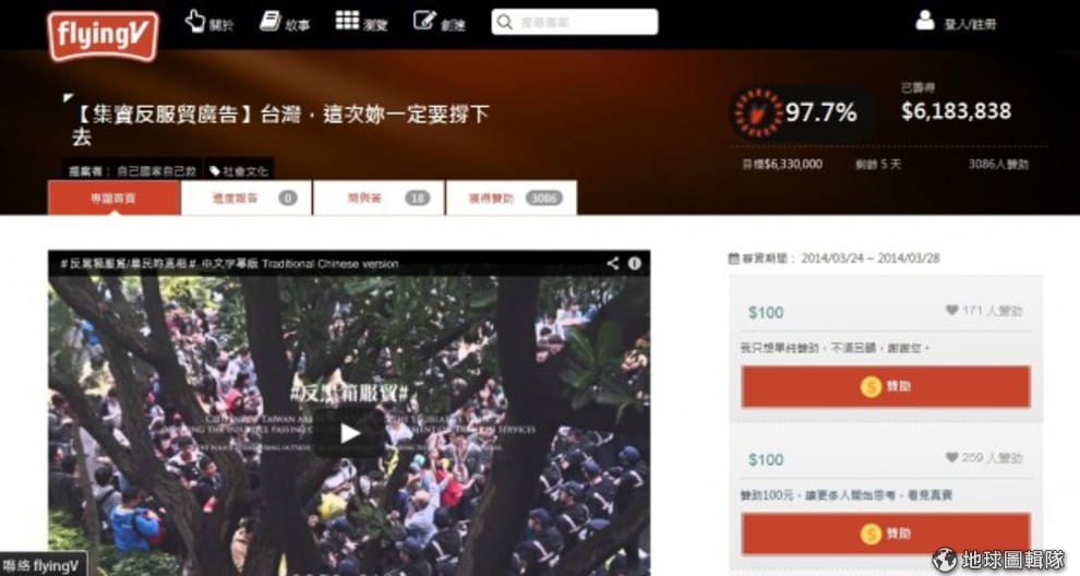 編註:本文原標題為「公民網路募資時代!反服貿活動於 FlyingV 3小時即達成募款目標」