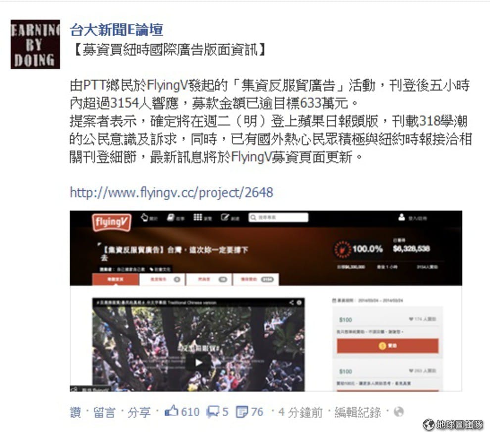 這些集資的 PTT 鄉民身分都為家庭主婦、上班族之類的普通人,在 FlyingV 確認身分後開始募款集資,沒想到第一階段的募資計畫在 36 分鐘內隨即募資完成,因此第二階段目標放大,將廣告目標放在外媒紐約時報上,希望能買下該版的全版廣告,由於紐約時報的國際版全版廣告價格約為美金 15 萬,加上第一階段募資目標的金額,設定總額 633 萬這個帶有政治意味的數字,並允諾餘款將會捐贈給反服貿活動主辦單位及活動受害者醫療費用。photo credit : colbrain via flickr