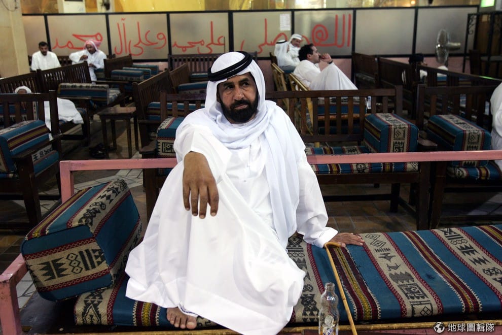 照片中的男子坐在當地老市場內的咖啡店中,他身後有大大的字樣寫著「願真主阿拉讚美先知穆罕默德以及他的跟隨者」(May Allah praise Prophet Mohammad and his followers)。