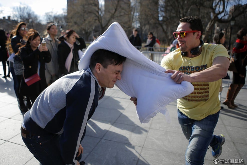 紐約當地,參賽者們高舉枕頭,準備一聽到哨音就開打