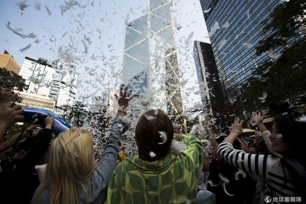香港當地的民眾互相揮舞羽毛枕頭,現場一片雪白