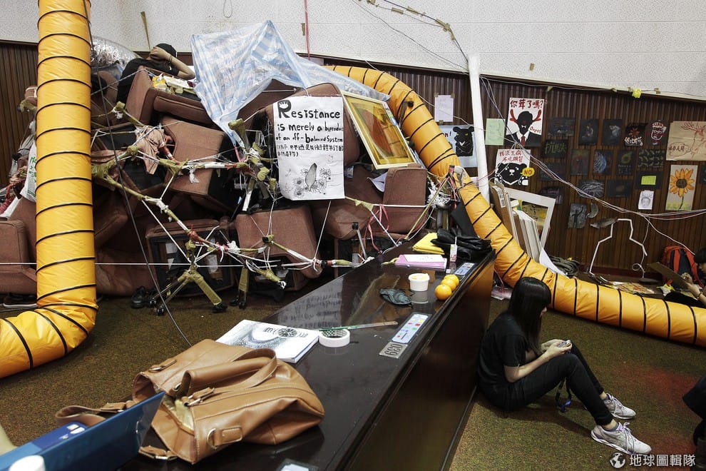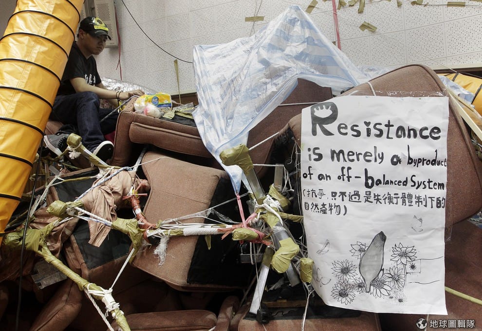 路透社立院內的障礙物旁貼著海報「抗爭,只不過是失衡體制下的自然產物」