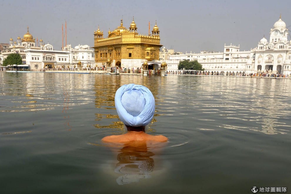 一名錫克教的信徒近在聖池中,他虔誠的對著聖殿黃金寺(Golden Temple)祈福禱告。圖片來源: NARINDER NANU/AFP/Getty Images
