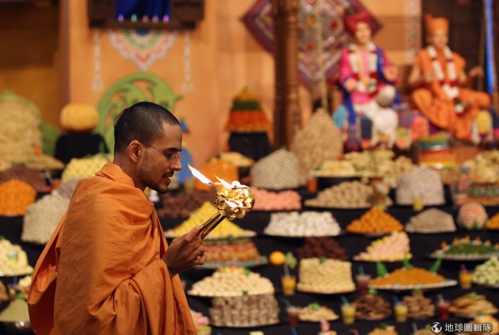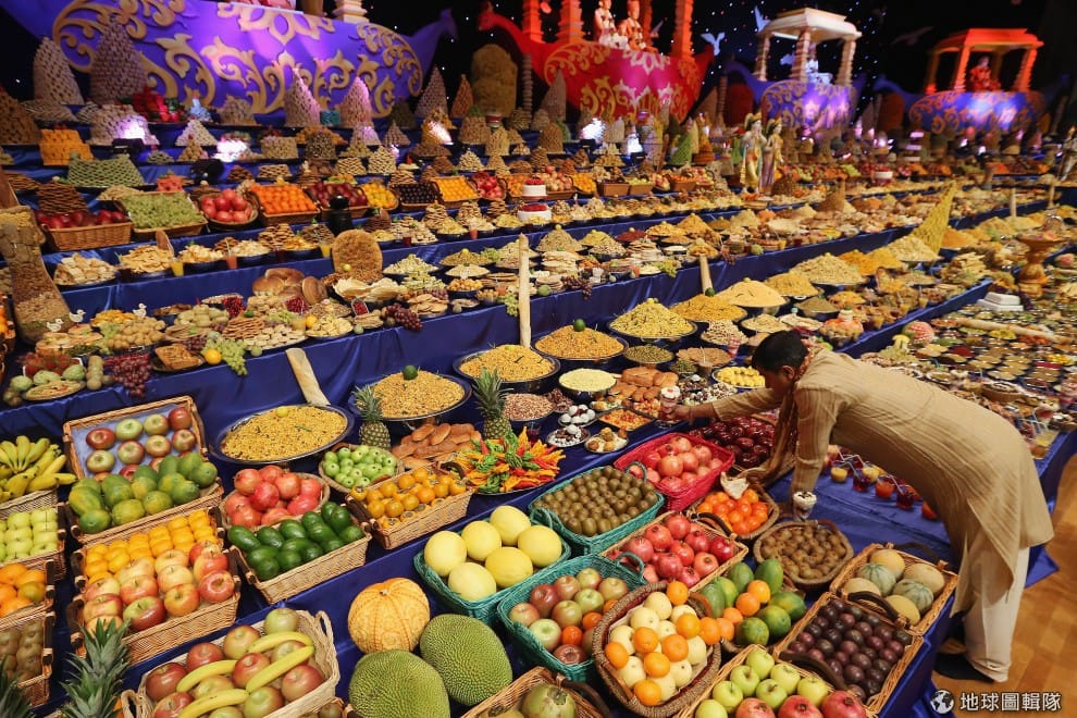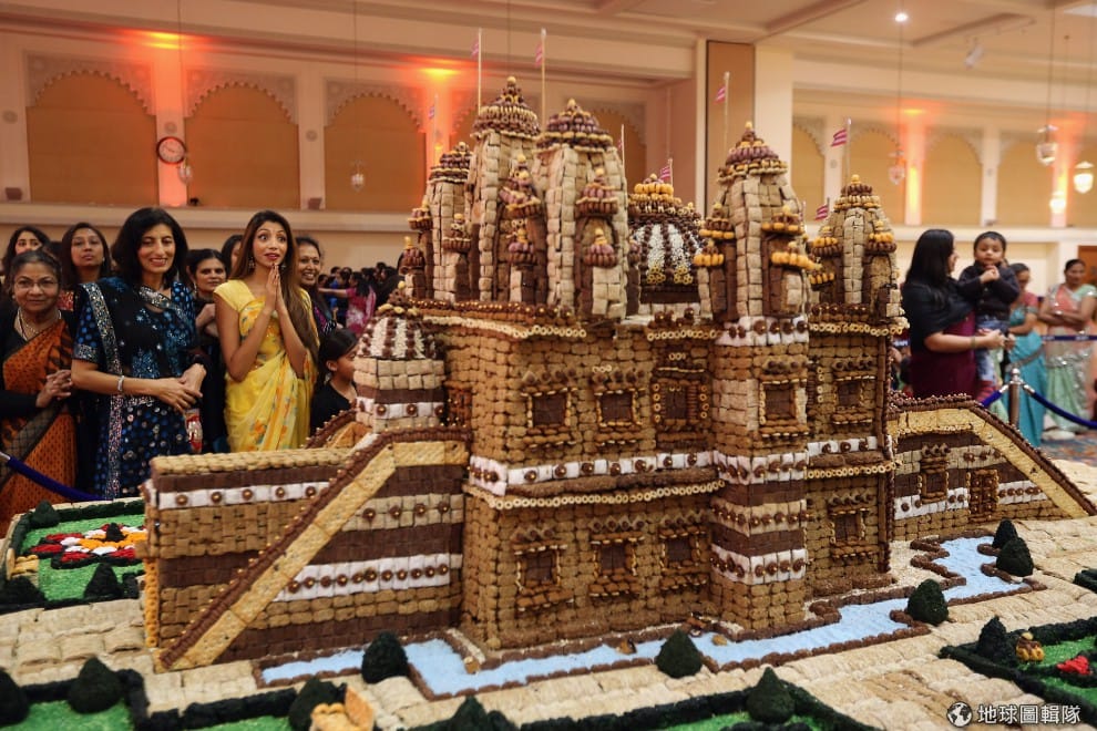 gettyimages照片中用食物堆起的聖殿超級華麗,連信眾自己都忍不住露出驚訝的表情!圖片來源:Dan Kitwood/Getty Images