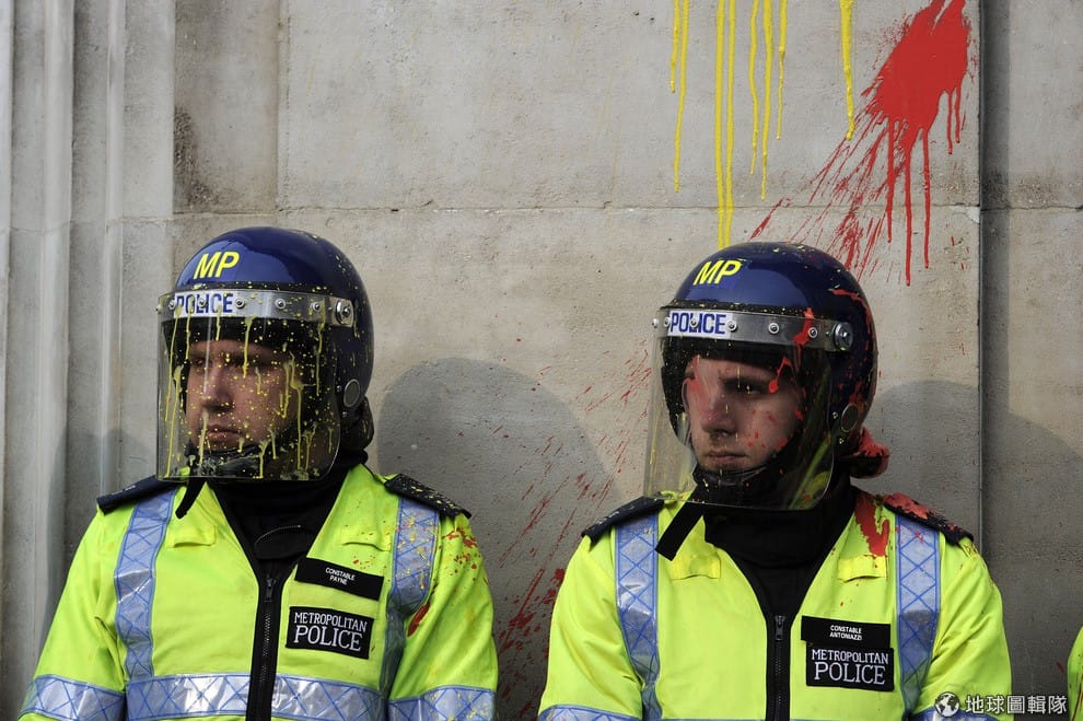 遭罷工勞工丟油漆的倫敦警察。