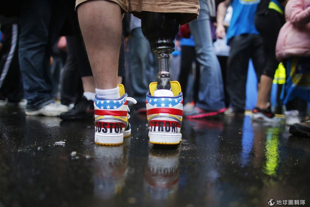 路透社一名在馬拉松炸彈案中失去腳的民眾,可見到他的鞋子上寫著「波士頓堅強」(Boston Strong)的字樣。