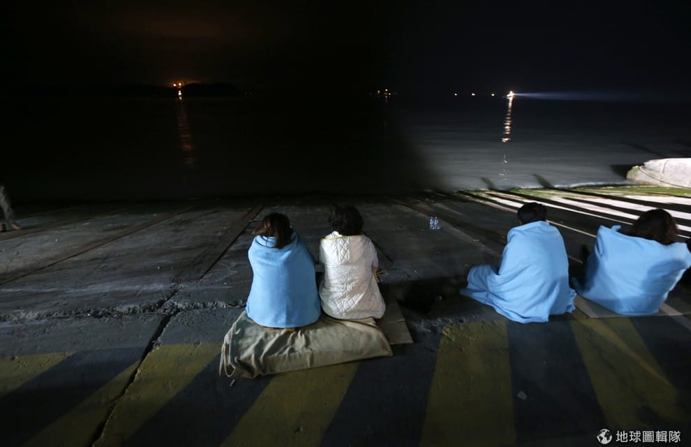 路透社家屬坐在岸邊看著海面上的照明燈火。