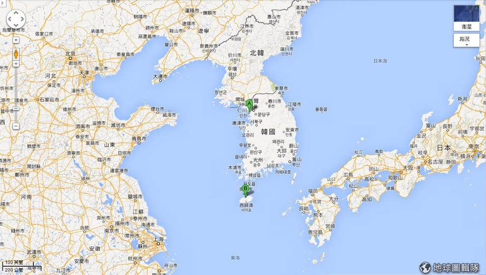 從仁川港(圖中A點)前往濟洲(B點)時,世越號傳出翻覆意外。