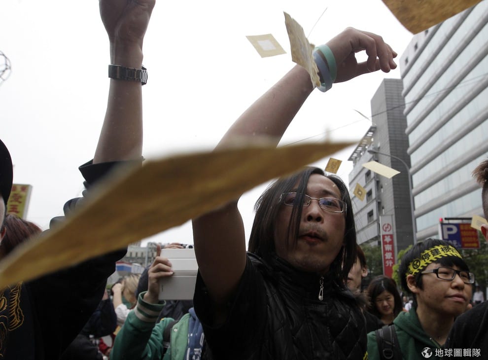 示威民眾揮舞終結核四等標語的旗幟