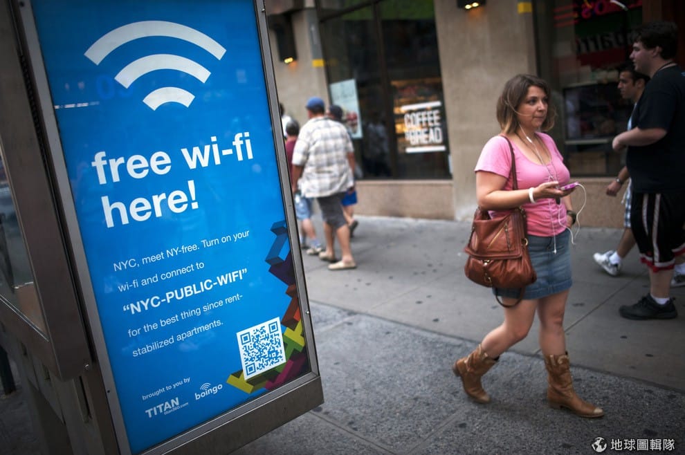 美國紐約市中,一名女子經過有免費wifi功能的電話亭。