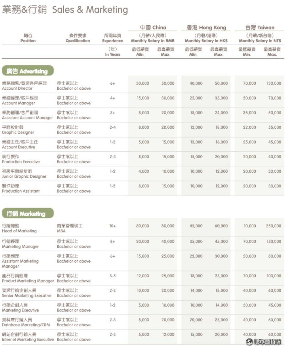 一般台灣的公司針對會計經理,不會付出比這個還要高的薪酬,但是在香港和中國的老闆會願意給,可見高階人才或高毛利企業的薪情差距。香港的財務相關工作發展已久,金融業與管理方面的薪酬相對較高,不過,在廣告市場就不是這樣了。