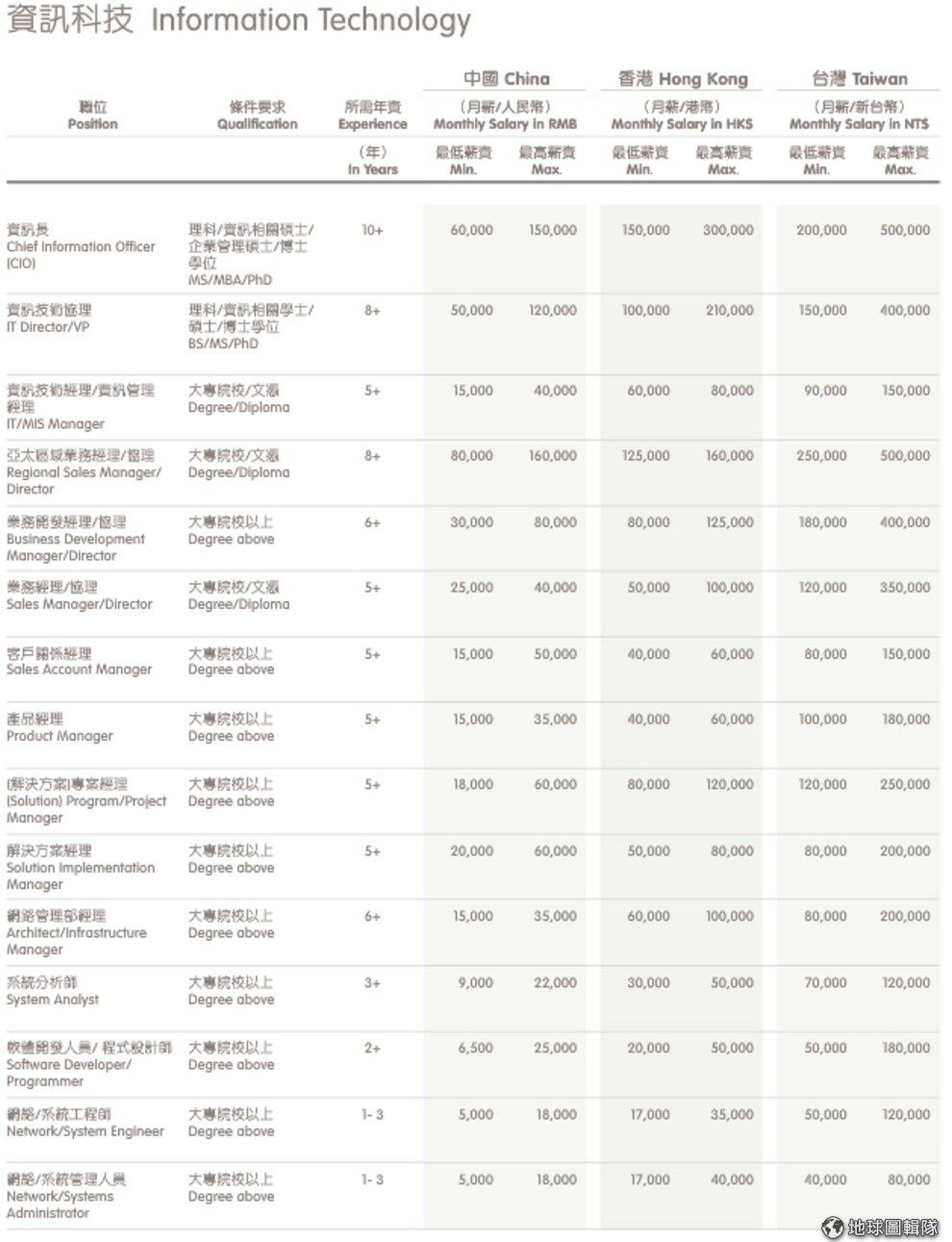 最後,我們看一下 IT 資訊人員的薪酬,發展資訊領域較久的台灣與香港,資訊長 (CIO) 的薪酬相對比中國市場要高。如果是工程師呢?