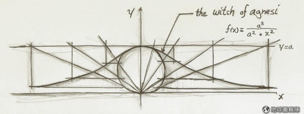 另外,在 Insituzional Analitiche 一書中,也研究了箕舌線。箕舌線,是透過簡易的數學原理畫出漸近線,詳細做法可研究上圖。箕舌線有另一個別名,叫做阿涅西的女巫 witch of agnesi,不過來源倒不是說阿涅西有多可惡,而其實是來自後人譯者的誤譯,將源自拉丁文字根的 Versiera 錯譯。