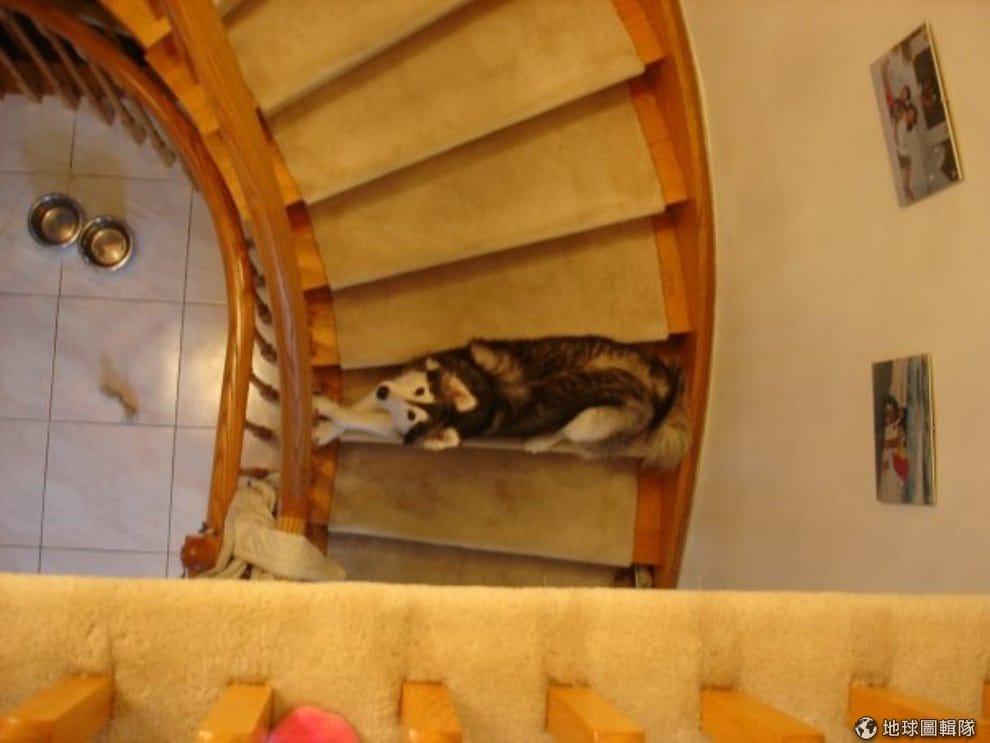 網友淘淘的主人通常不會讓牠上樓,但牠還是會偷偷找機會一階一階向上爬,你想知道牠有多想看你下樓的話,看看牠爬了幾階樓梯就知道。照片中的急迫程度大概是30分。