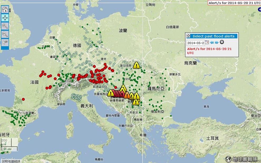 根據歐洲議會提供的觀測資料,這次受到水患侵襲的地區遍布東南歐一帶,圖片中可見許多地方發布了警告