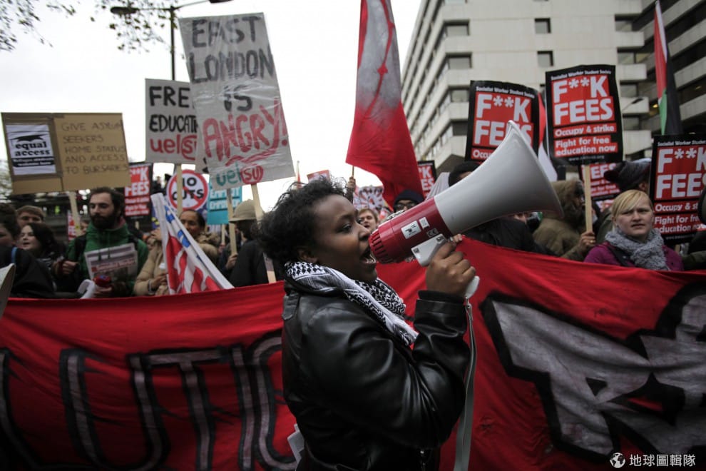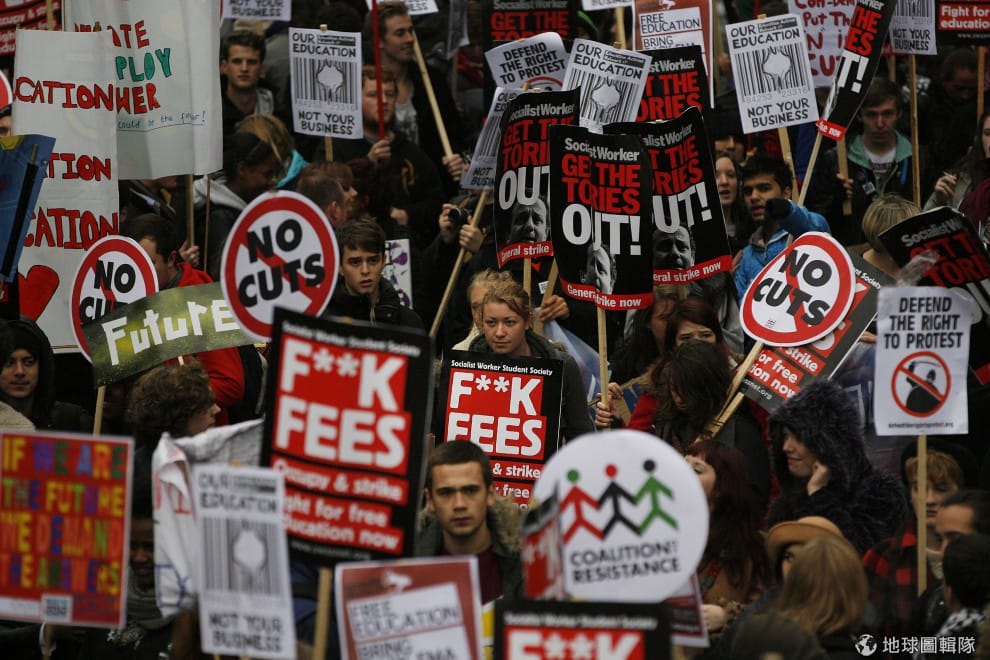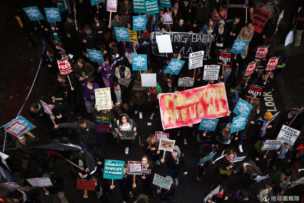 高舉抗議標語,學生特意要選在國會殿堂所在的市區表達不滿!圖片來源:Oli Scarff/Getty Images