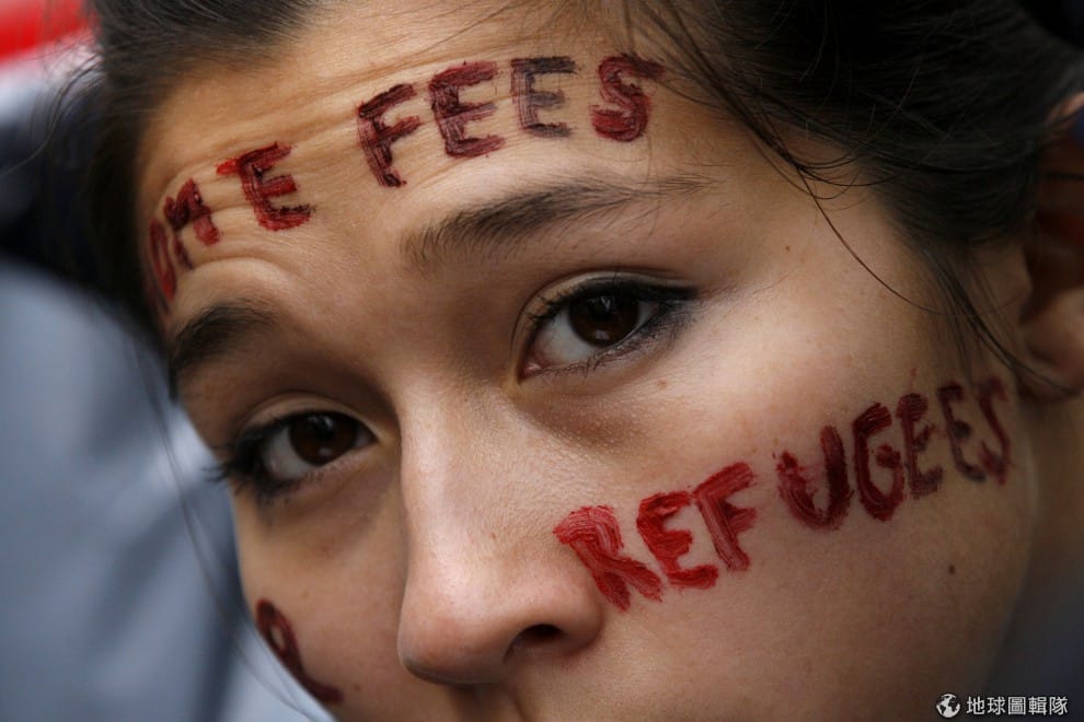 示威學生在臉上寫著「難民」兩字表達他們的窘境。圖片來源:Warrick Page/Getty Images