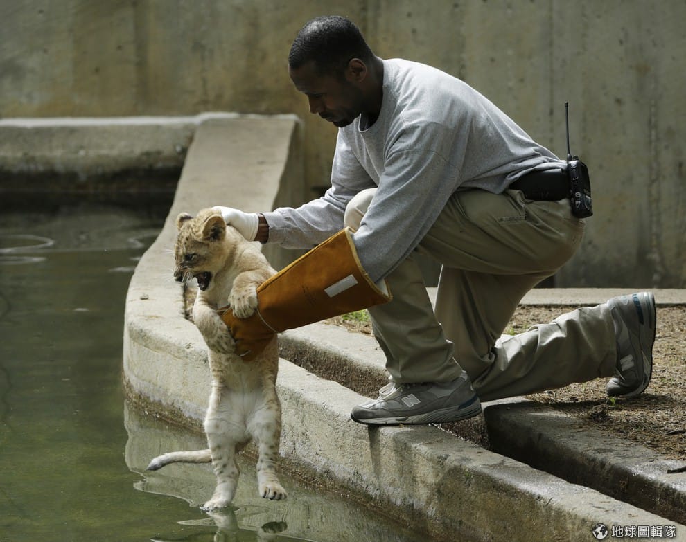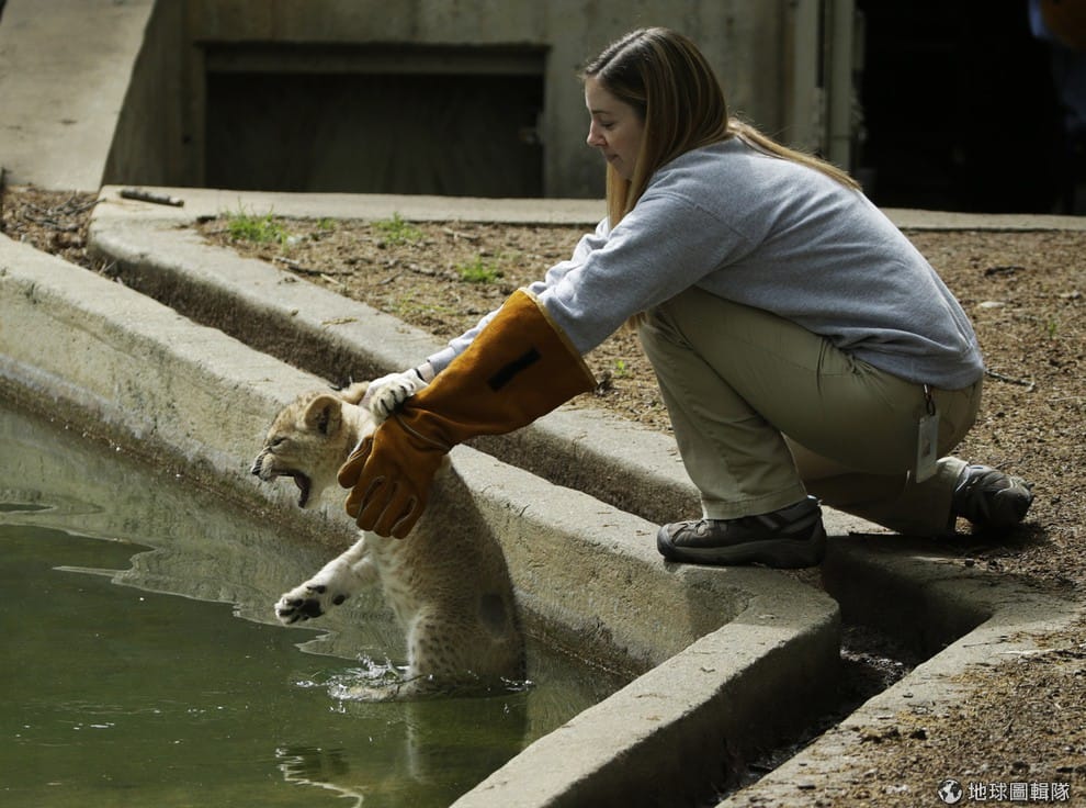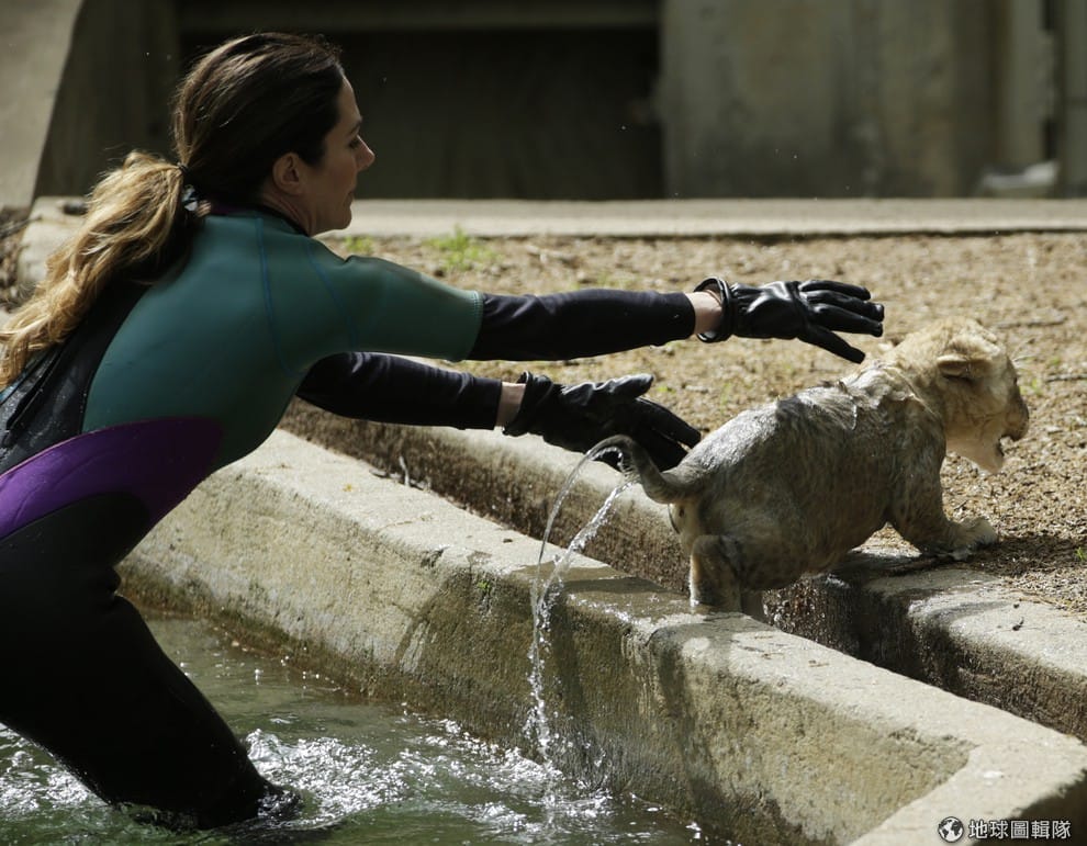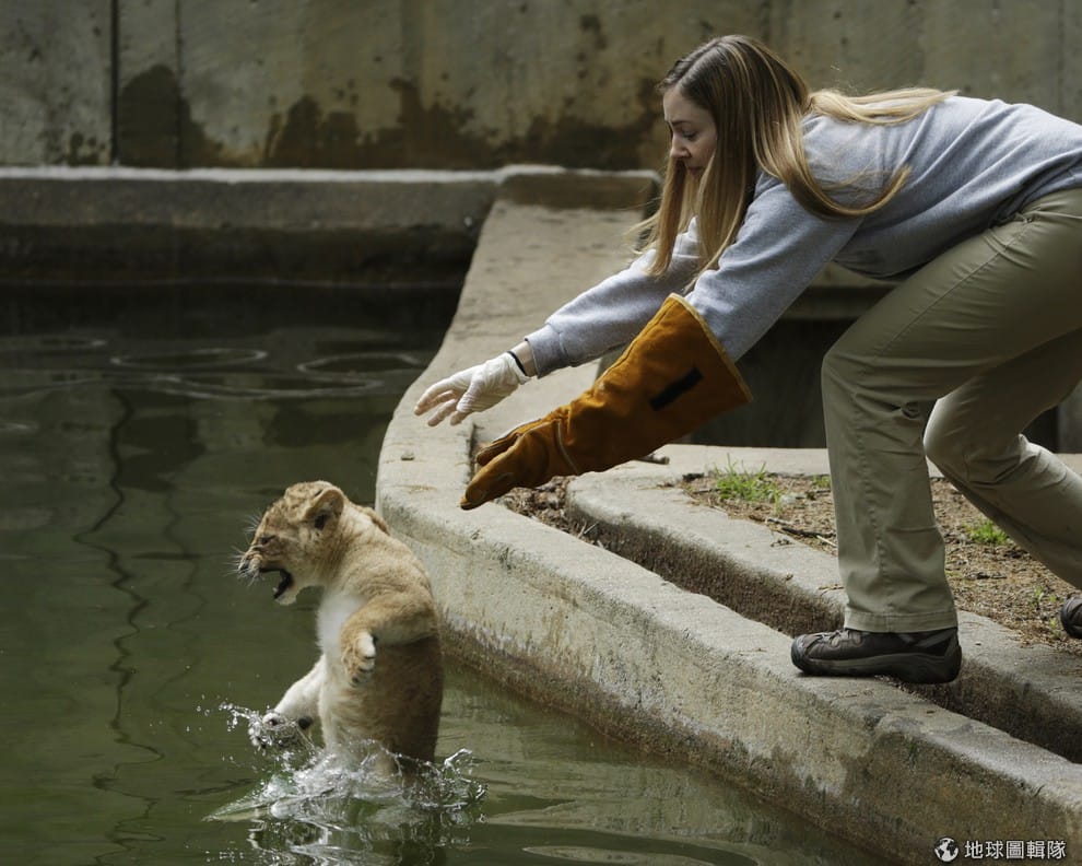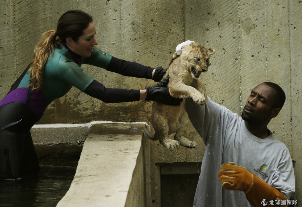 動物園的生物學家萊(Leigh Pitsko)慢慢地把小公獅放進水裡。