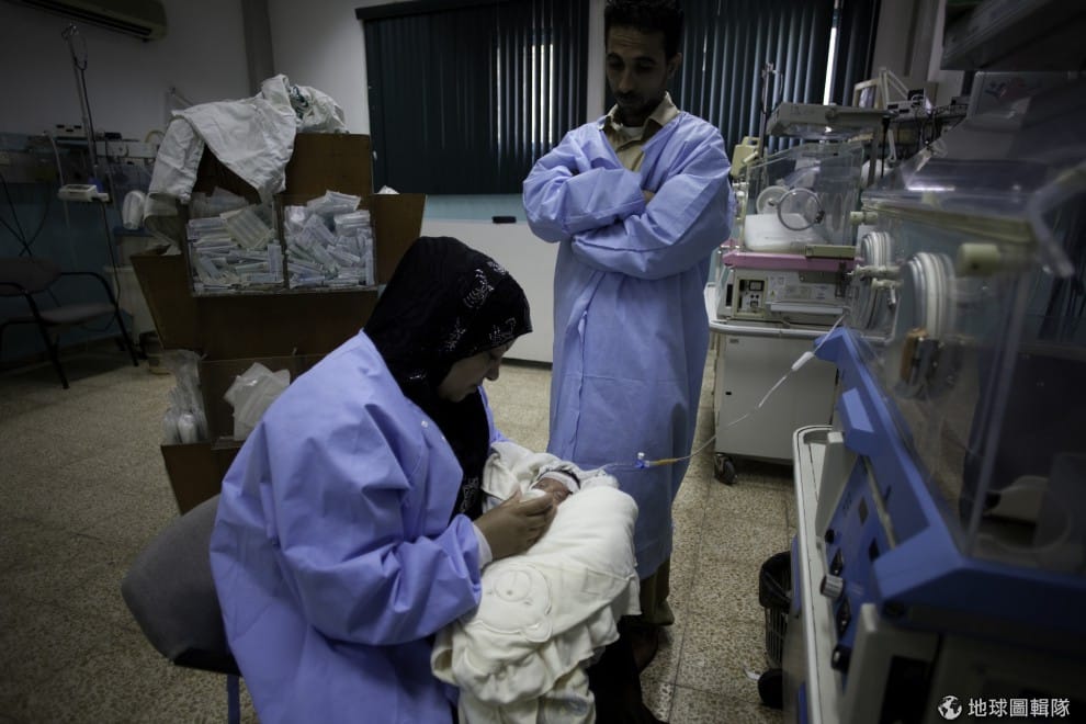 抱著他們早產寶寶的父母。圖片來源:Eman Mohammed/Getty Images