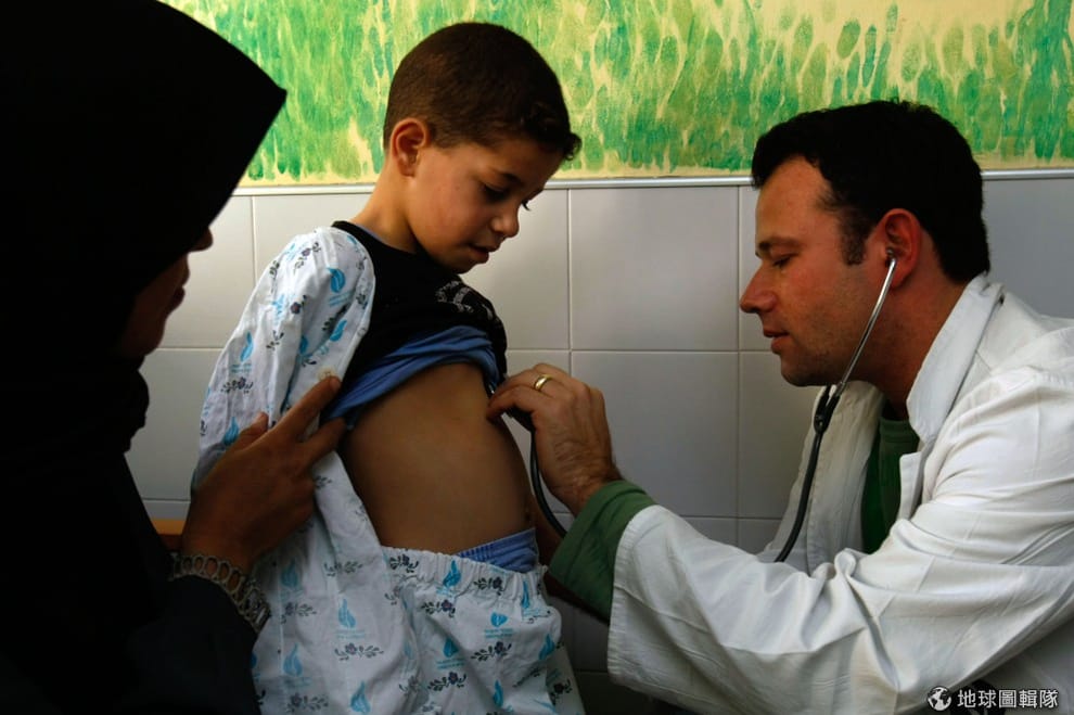 另一名巴勒斯坦小男生,生病的他奄奄一息,一旁的爸爸很擔心,他們整等著醫生過來檢查。圖片來源:Eman Mohammed/Getty Images