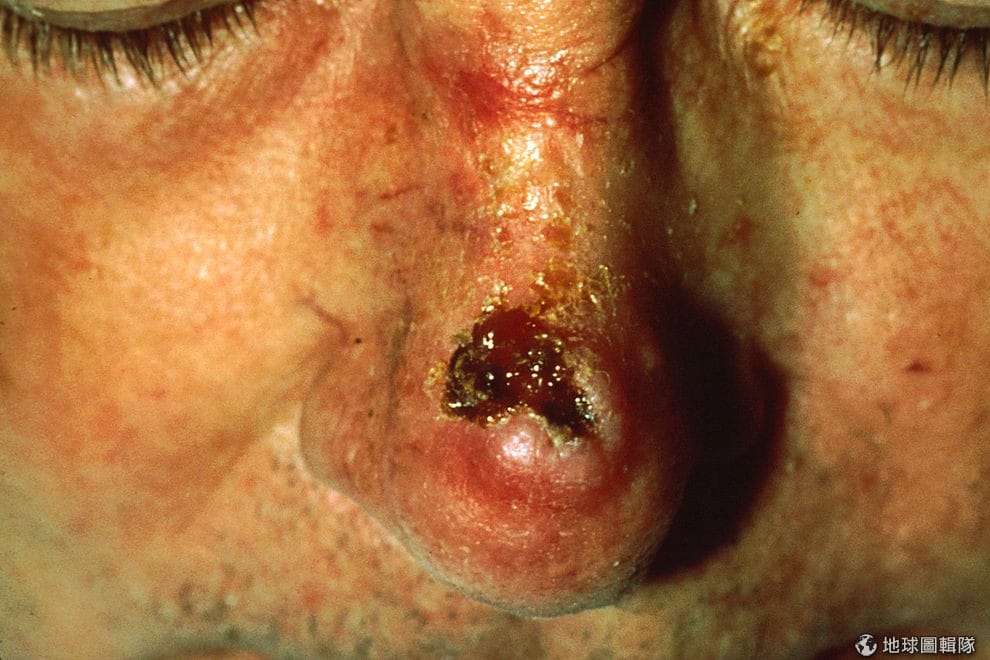 繼續閱讀一名患者的鼻子有皮膚癌的病灶,可見中間部分出現潰爛的現象。Photo credit: wikicommons